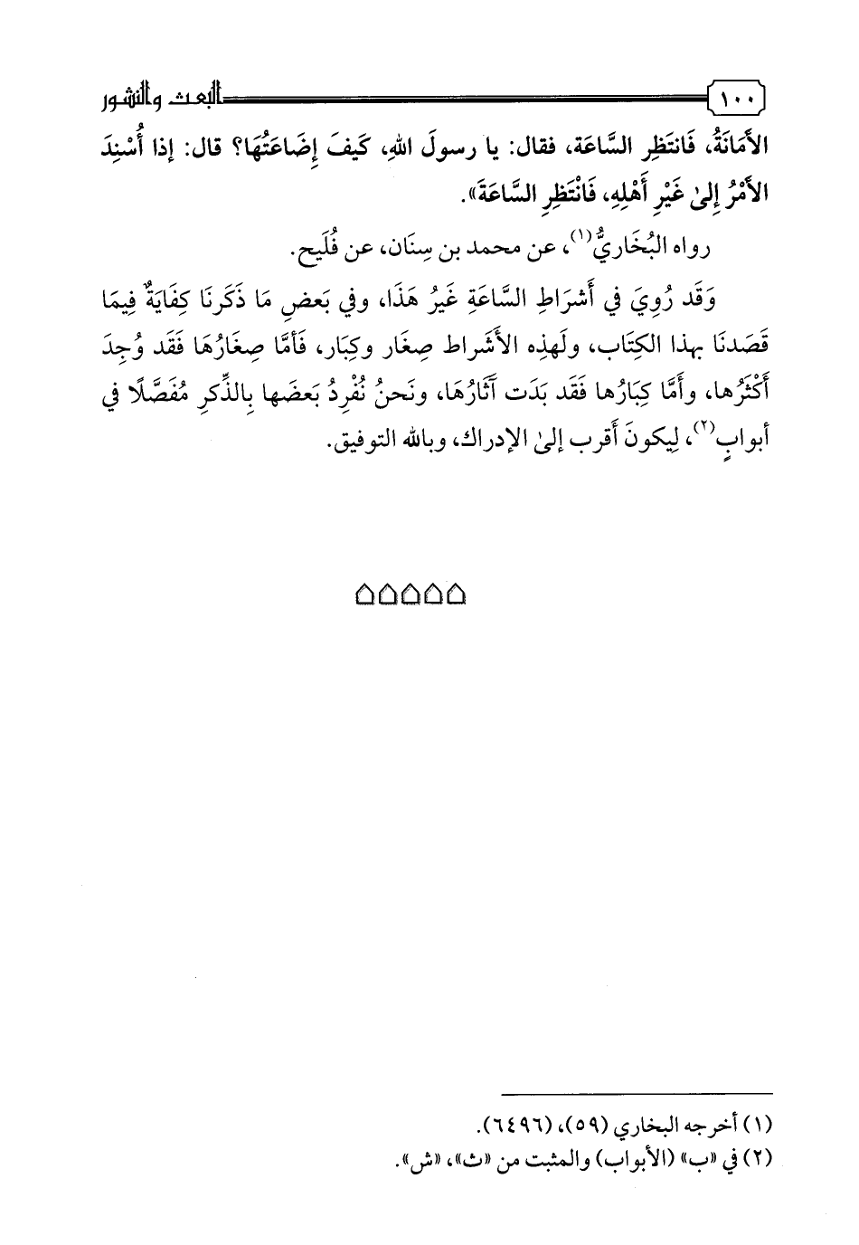 وَقَد رُوِيَ في أَشرَاطِ السَّاعَةِ غَيرُ هَذَا، وفي بَعضِ مَا ذَكَرنَا كِفَايَةٌ فِيمَا قَصَدنَا بهذا الكِتَاب، ولَهذِه الأَشَراط صِغَار وكِبَار، فَأمَّا صِغَارُهَا فَقَد وُجِدَ أَكْثَرُها، وأَمَّا كِبَارُها فَقَد بَدَت آَثَارُهَا، ونَحنُ نُفْرِدُ بَعضَها بِالذِّكرِ مُفَصَّلًا في أبوابٍ (٢)، لِيكونَ أَقرب إلى الإدراك، وبالله التوفيق.