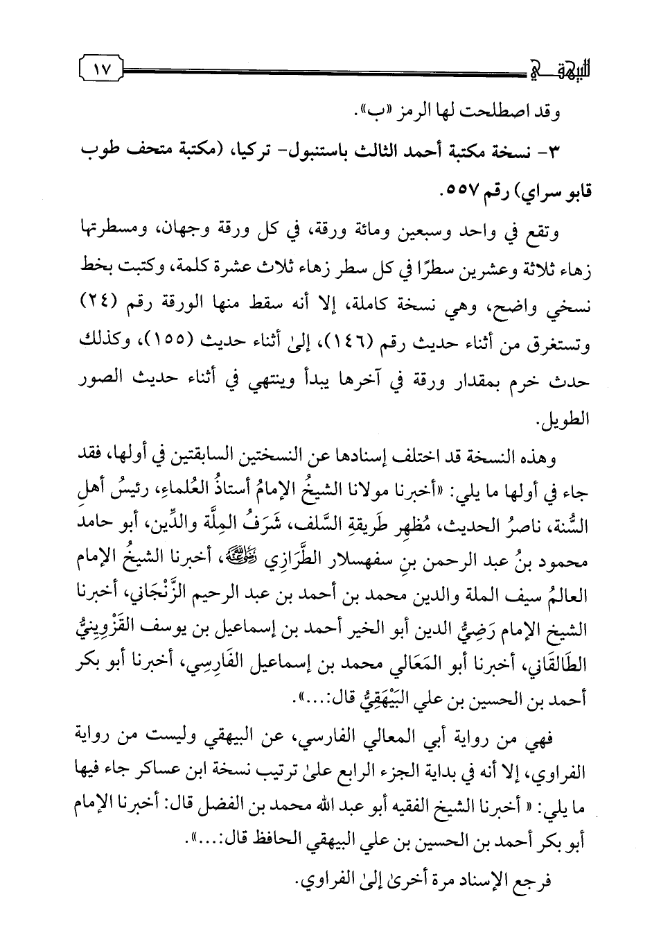 ٣ - نسخة مكتبة أحمد الثالث باستنبول- تركيا، (مكتبة متحف طوب قابو سراي) رقم ٥٥٧.