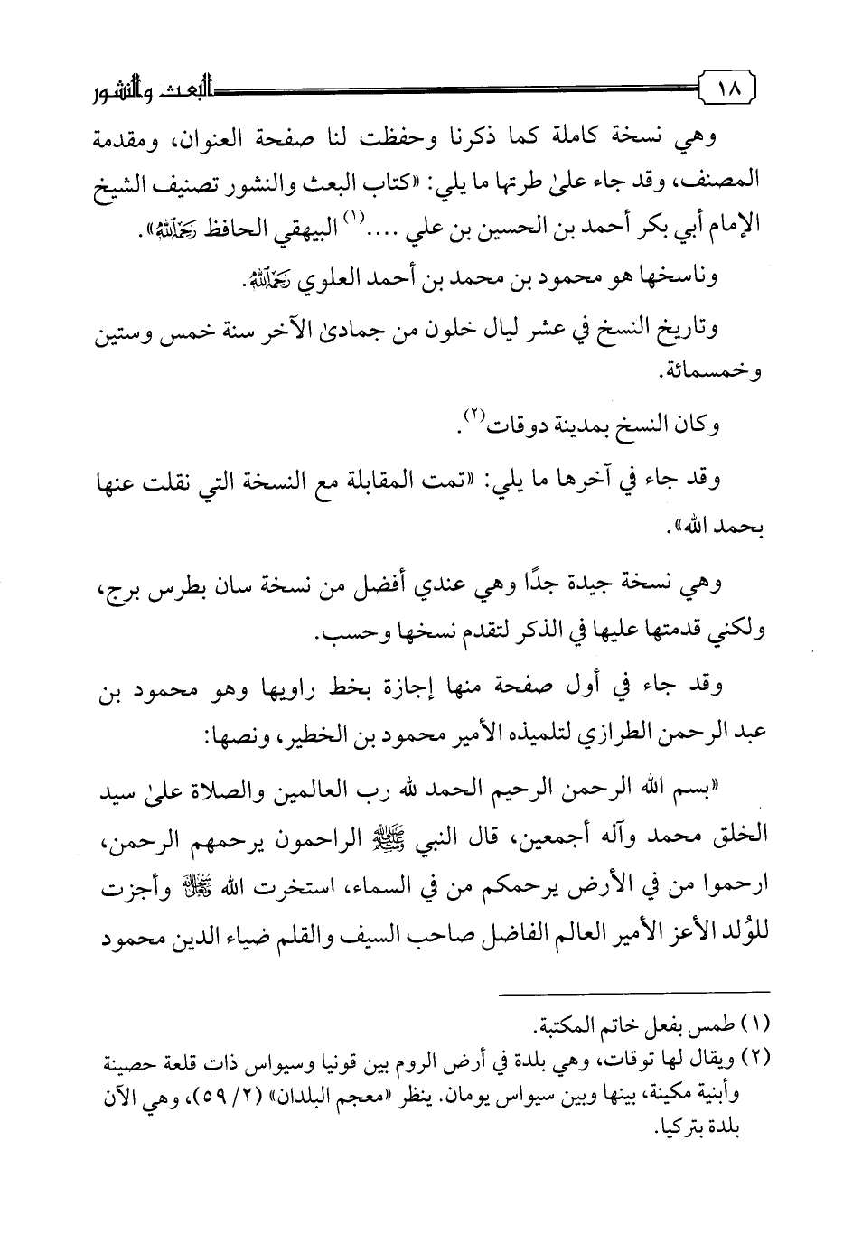 وهي نسخة كاملة كما ذكرنا وحفظت لنا صفحة العنوان، ومقدمة المصنف، وقد جاء على طرتها ما يلي: «كتاب البعث والنشور تصنيف الشيخ الإمام أبي بكر أحمد بن الحسين بن علي .... (١) البيهقي الحافظ رحمه الله».