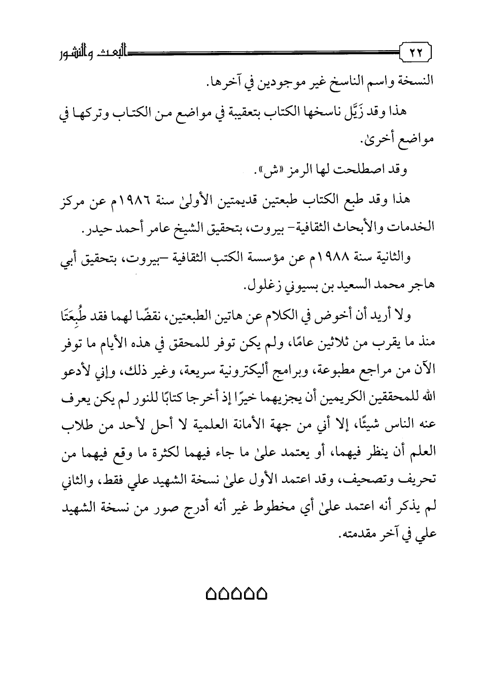 ولا أريد أن أخوض في الكلام عن هاتين الطبعتين، نقضًا لهما فقد طبعتا منذ ما يقرب من ثلاثين عاما، ولم يكن توفر للمحقق في هذه الأيام ما توفر الآن من مراجع مطبوعة، وبرامج أليكترونية سريعة، وغير ذلك، وإني لأدعو الله للمحققين الكريمين أن يجزيهما خيرًا إذ أخرجا كتاب للنور لم يكن يعرف عنه الناس شيئا، إلا أني من جهة الأمانة العلمية لا أحل لأحد من طلاب العلم أن ينظر فيهما، أو يعتمد على ما جاء فيهما لكثرة ما وقع فيهما من تحريف وتصحيف، وقد اعتمد الأول على نسخة الشهيد علي فقط، والثاني لم يذكر أنه اعتمد على أي مخطوط غير أنه أدرج صور من نسخة الشهيد علي في آخر مقدمته.