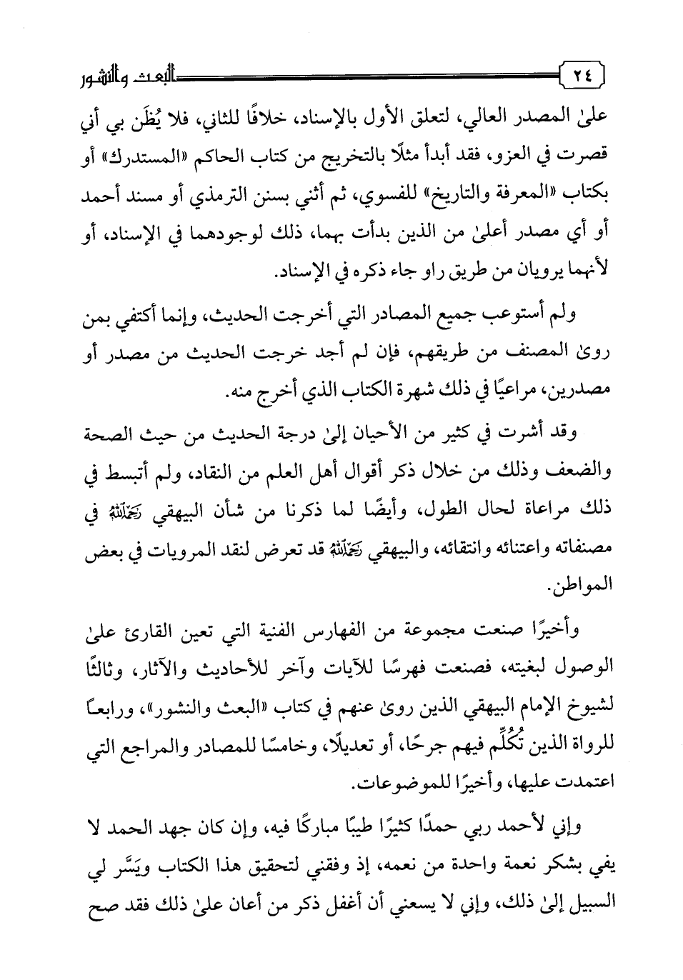 على المصدر العالي، لتعلق الأول بالإسناد، خلافا للثاني، فلا يُظَن بي أني قصرت في العزو، فقد أبدأ مثلا بالتخريج من كتاب الحاكم «المستدرك» أو بكتاب «المعرفة والتاريخ» للفسوي، ثم أثني بسنن الترمذي أو مسند أحمد أو أي مصدر أعلى من الذين بدأت بهما، ذلك لوجودهما في الإسناد، أو لأنهما يرويان من طريق راو جاء ذكره في الإسناد.