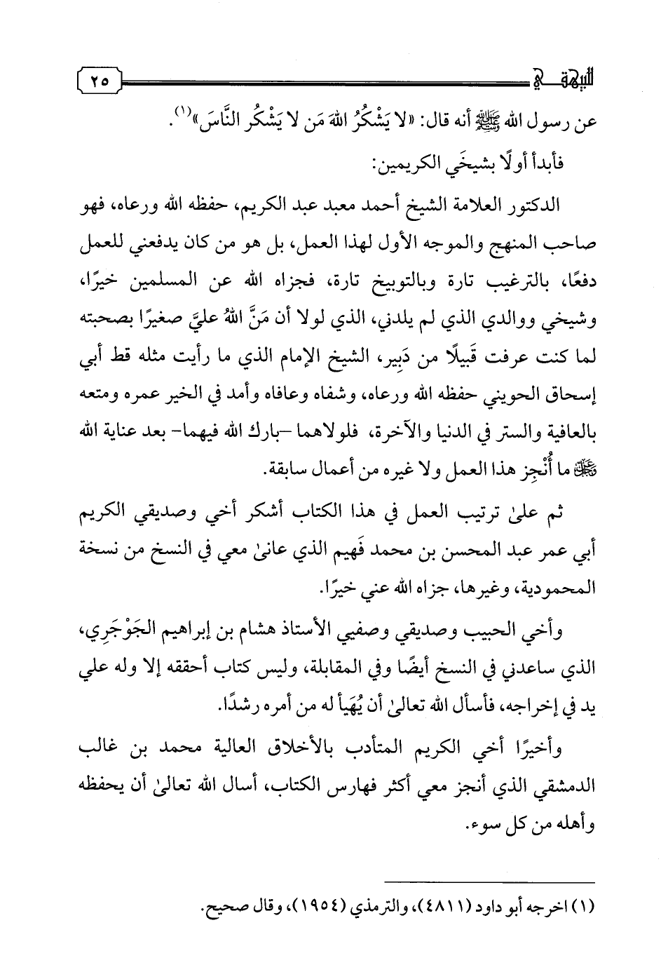 ثم على ترتيب العمل في هذا الكتاب أشكر أخي وصديقي الكريم أبي عمر عبد المحسن بن محمد فَهيم الذي عانى معي في النسخ من نسخة المحمودية، وغيرها.