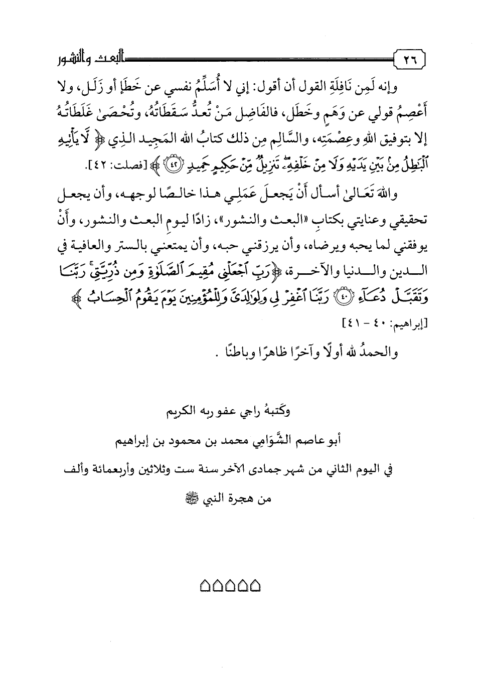 واللهَ تَعَالى أسأل أَنْ يَجعلَ عَمَلِي هذا خالصًا لوجهه، وأن يجعل تحقيقي وعنايتي بكتابٍ «البعث والنشور»، زادًا ليومِ البعث والنشور، وأَنْ يوفقني لما يحبه ويرضاه، وأن يرزقني حبه، وأن يمتعني بالستر والعافية في الدين والدنيا والآخرة، {رَبِّ اجْعَلْنِي مُقِيمَ الصَّلَاةِ وَمِنْ ذُرِّيَّتِي رَبَّنَا وَتَقَبَّلْ دُعَاءِ (٤٠) رَبَّنَا اغْفِرْ لِي وَلِوَالِدَيَّ وَلِلْمُؤْمِنِينَ يَوْمَ يَقُومُ الْحِسَابُ} [إبراهيم: ٤٠ - ٤١]