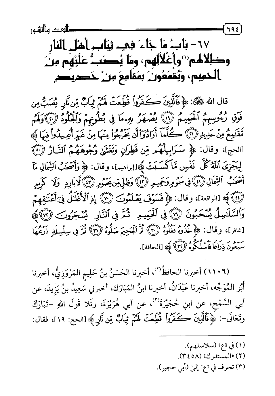 ٦٧ - بَابُ مَا جَاءَ فِي ثِيَابِ أَهْلِ النارِ وظِلالهم (١) وأَغْلالِهِم، ومَا يُصَبُّ عَلَيْهِم مِنَ الحَمِيمِ، وَيُقْمَعُونَ بِمَقَامِعَ مِنْ حَدِيدٍ