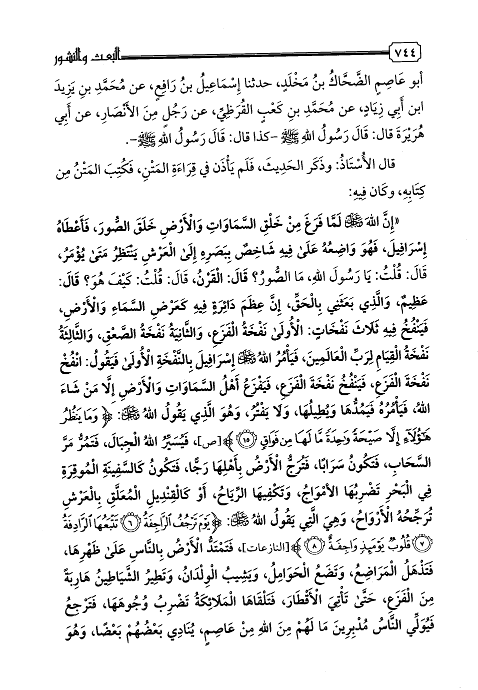 «إِنَّ اللَّهَ - عز وجل - لَمَّا فَرَغَ مِنْ خَلْقِ السَّمَوَاتِ وَالْأَرْضِ خَلَقَ الصُّورَ، فَأَعْطَاهُ إِسْرَافِيلَ، فَهُوَ وَاضِعُهُ عَلَى فِيهِ شَاخِصٌ بِبَصَرِهِ إِلَى الْعَرْشِ يَنْتَظِرُ مَتَى يُؤْمَرُ، قَالَ: قُلْتُ: يَا رَسُولَ اللَّهِ، مَا الصُّورُ؟ قَالَ: الْقَرْنُ، قَالَ: قُلْتُ: كَيْفَ هُوَ؟ قَالَ: عَظِيمٌ، وَالَّذِي بَعَثَنِي بِالْحَقِّ، إِنَّ عِظَمَ دَائِرَةٍ فِيهِ كَعَرْضِ السَّمَاءِ وَالْأَرْضِ، فَيَنْفُخُ فِيهِ ثَلَاثَ نَفْخَاتٍ: الْأُولَى نَفْخَةُ الْفَزَعِ، وَالثَّانِيَةُ نَفْخَةُ الصَّعْقِ، وَالثَّالِثَةُ نَفْخَةُ الْقِيَامِ لِرَبِّ الْعَالَمِينَ، فَيَأْمُرُ اللَّهُ - عز وجل - إِسْرَافِيلَ بِالنَّفْخَةِ الْأُولَى فَيَقُولُ: انْفُخْ نَفْخَةَ الْفَزَعِ، فَيَنْفُخُ نَفْخَةَ الْفَزَعِ، فَيَفْزَعُ أَهْلُ السَّمَوَاتِ وَالْأَرْضِ إِلَّا مَنْ شَاءَ اللَّهُ، فَيَأْمُرُهُ فَيَمُدُّهَا وَيُطِيلُهَا، وَلَا يَفْتُرُ، وَهُوَ الَّذِي يَقُولُ اللَّهُ - عز وجل -: {وَمَا يَنْظُرُ هَؤُلَاءِ إِلَّا صَيْحَةً وَاحِدَةً مَا لَهَا مِنْ فَوَاقٍ (١٥)} [ص]، فَيُسَيِّرُ اللَّهُ الْجِبَالَ، فَتَمُرُّ مَرَّ السَّحَابِ، فَتَكُونُ سَرَابًا، فَتَرُجُّ الْأَرْضَ بِأَهْلِهَا رَجًّا، فَتَكُونُ كَالسَّفِينَةِ الْمُوقِرَةِ فِي الْبَحْرِ تَضْرِبُهَا الأمْوَاجُ، وَتَكْفِيهَا الرِّيَاحُ، أَوْ كَالْقِنْدِيلِ الْمُعَلَّقِ بِالْعَرْشِ تُرَجِّحُهُ الْأَرْوَاحُ، وَهِيَ الَّتِي يَقُولُ اللَّهُ - عز وجل -: {يَوْمَ تَرْجُفُ الرَّاجِفَةُ (٦) تَتْبَعُهَا الرَّادِفَةُ (٧) قُلُوبٌ يَوْمَئِذٍ وَاجِفَةٌ (٨)} [النازعات]، فَتَمْتَدُّ الْأَرْضُ بِالنَّاسِ عَلَى ظَهْرِهَا، فَتَذْهَلُ الْمَرَاضِعُ، وَتَضَعُ الْحَوَامِلُ، وَيَشِيبُ الْوِلْدَانُ، وَتَطِيرُ الشَّيَاطِينُ هَارِبَةً مِنَ الْفَزَعِ، حَتَّى تَأْتِيَ الْأَقْطَارَ، فَتَلْقَاهَا