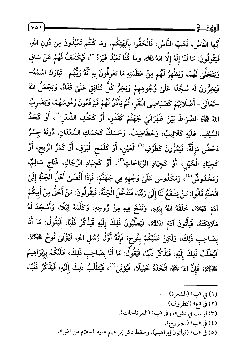 أَيُّها النَّاسُ، ذَهَبَ النَّاسُ، فَالْحَقُوا بِآلِهَتِكُم، ومَا كُنْتُم تَعْبُدُونَ مِن دُونِ اللهِ، فَيَقُولُونَ: مَا لَنَا إِلَهٌ إِلَّا اللهُ - عز وجل -، وما كُنَّا نَعْبُدُ غَيْرَهُ ٨)، فَيُكْشَفُ لَهُمْ عَنْ سَاقٍ وَيَتَجَلَّى لَهُمْ، وَيُظْهِرُ لَهُمْ مِنْ عَظَمَتِهِ مَا يَعْرِفُونَ بِهِ أَنَّهُ رَبُّهُمْ- تَبَارَك اسْمُهُ- فَيَخِرُّونَ لَه سُجَّدًا عَلَى وُجُوهِهِمْ وَيَخِرُّ كُلُّ مُنَافِقٍ عَلَى قَفَاهُ، وَيَجْعَلُ اللَّهُ -تَعَالَى- أَصْلَابَهُمْ كَصَيَاصِي الْبَقَرِ، ثُمَّ يَأْذَنُ لَهُمْ فَيَرْفَعُونَ رُءُوسَهُمْ، وَيَضْرِبُ اللَّهُ - عز وجل - الصِّرَاطَ بَيْنَ ظَهْرَانَيْ جَهَنَّمَ كَقَدْرِ، أَوْ كَعَقْدِ، الشَّعْرِ (١)، أَوْ كَحَدِّ السَّيْفِ، عَلَيْهِ كَلَالِيبُ، وَخَطَاطِيفُ، وَحَسَكٌ كَحَسَكِ السَّعْدَانِ، دُونَهُ جِسْرٌ دَحْضٌ مَزِلَّةٌ، فَيَمُرُّونَ كَطَرْفِ (٢) الْعَيْنِ، أَوْ كَلَمْحِ الْبَرْقِ، أَوْ كَمَرِّ الرِّيحِ، أَوْ كَجِيَادِ الْخَيْلِ، أَوْ كَجِيَادِ الرِّيَاحَاتِ (٣)، أَوْ كَجِيَادِ الرِّجَالِ، فَنَاجٍ سَالِمٌ، وَمَخْدُوشٌ (٤)، وَمَكْدُوس عَلَى وَجْهِهِ فِي جَهَنَّمَ، فَإِذَا أَفْضَى أَهْلُ الْجَنَّةِ إِلَى الْجَنَّةِ قَالُوا: مَنْ يَشْفَعُ لَنَا إِلَى رَبِّنَا، فَنَدْخُلَ الْجَنَّةَ، فَيَقُولُونَ: مَنْ أَحَقُّ مِنْ أَبِيكُمْ آدَمَ - عليه السلام -، خَلَقَهُ اللَّهُ بِيَدِهِ، وَنَفَخَ فِيهِ مِنْ رُوحِهِ، وَكَلَّمَهُ قِبَلًا، وَأَسْجَدَ لَهُ مَلَائِكَتَهُ، فَيَأْتُونَ آدَمَ - عليه السلام -، فَيَطْلُبُونَ ذَلِكَ إِلَيْهِ فَيَذْكُرُ ذَنْبًا، فَيَقُولُ: مَا أَنَا بِصَاحِبِ ذَلِكَ، وَلَكِنْ عَلَيْكُمْ بِنُوحٍ؛ فَإِنَّهُ أَوَّلُ رُسُلِ اللَّهِ، فَيُؤْتَى نُوحٌ - عليه السلام -، فَيُطْلَبُ ذَلِكَ إِلَيْهِ، فَيَذْكُرُ ذَنْبًا، فَيَقُولُ: مَا أَنَا بِصَاحِبِ ذَلِكَ، عَلَيْكُمْ بِإِبْرَاهِيمَ - عليه السلام -؛ فَإِنَّ اللَّهَ - عز وجل - اتَّخَذَهُ خَلِيلًا، فَيُؤْتَى (٥)، فَيُطْلَبُ ذَلِكَ إِلَيْهِ، فَيَذْكُرُ ذَنْبًا،