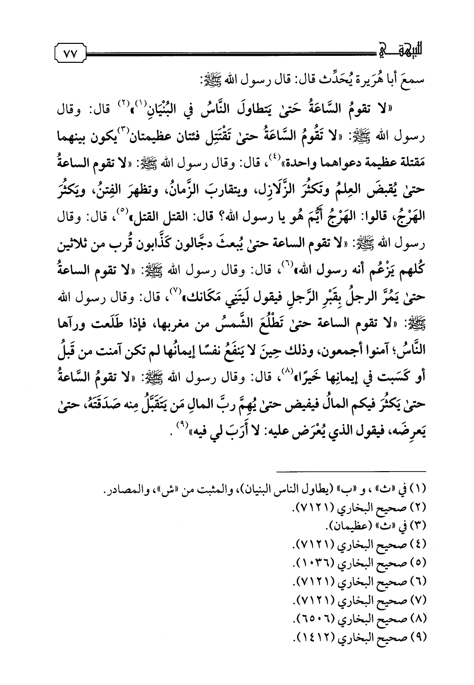 «لا تقومُ الساعةُ حتى يَتطاول النَّاسُ في البنيان (١)» (٢) قال: وقال رسول الله - صلى الله عليه وسلم -: «لا تقوم الساعةُ حتى تَقْتَتِل فئتان عظيمتان (٣) يكون بينهما مَقتلة عظيمة دعواهما واحدة» (٤)، قال: وقال رسول الله - صلى الله عليه وسلم -: «لا تقوم الساعةُ حتى يُقبضَ العِلمُ وتَكثُرَ الزلازل، ويتقاربَ الزَّمانُ، وتظهرَ الفِتنُ، ويَكثُرَ الهَرْجُ، قالوا: الهَرْجُ أَيُّمَ هُو يا رسول الله؟ قال: القتل القتل» (٥)، قال: وقال رسول الله - صلى الله عليه وسلم -: «لا تقوم الساعة حتى يُبعثَ دجَّالون كَذَّابون قُرب من ثلاثين كُلهم يَزْعُم أنه رسول الله» (٦)، قال: وقال رسول الله - صلى الله عليه وسلم -: «لا تقوم الساعةُ حتى يَمُرَّ الرجلُ بِقَبْرِ الرَّجلِ فيقول لَيتَنِي مَكَانك» (٧)، قال: وقال رسول الله - صلى الله عليه وسلم -: «لا تقوم الساعة حتى تَطْلُعَ الشَّمسُ من مغربها، فإذا طَلَعت ورآها النَّاسُ؛ آمنوا أجمعون، وذلك حِينَ لا يَنفَعُ نفسًا إيمانُها لم تكن آمنت من قَبلُ أو كَسَبت في إيمانِها خَيرًا» (٨)، قال: وقال رسول الله - صلى الله عليه وسلم -: «لا تقومُ السَّاعةُ حتى يَكثُرَ فيكم المالُ فيفيض حتى يُهِمَّ ربَّ المالِ مَن يَتَقَبَّلُ مِنه صَدَقَتَهُ، حتى يَعرِضَه، فيقول الذي يُعْرَض عليه: لا أَرَبَ لي فيه» (٩).