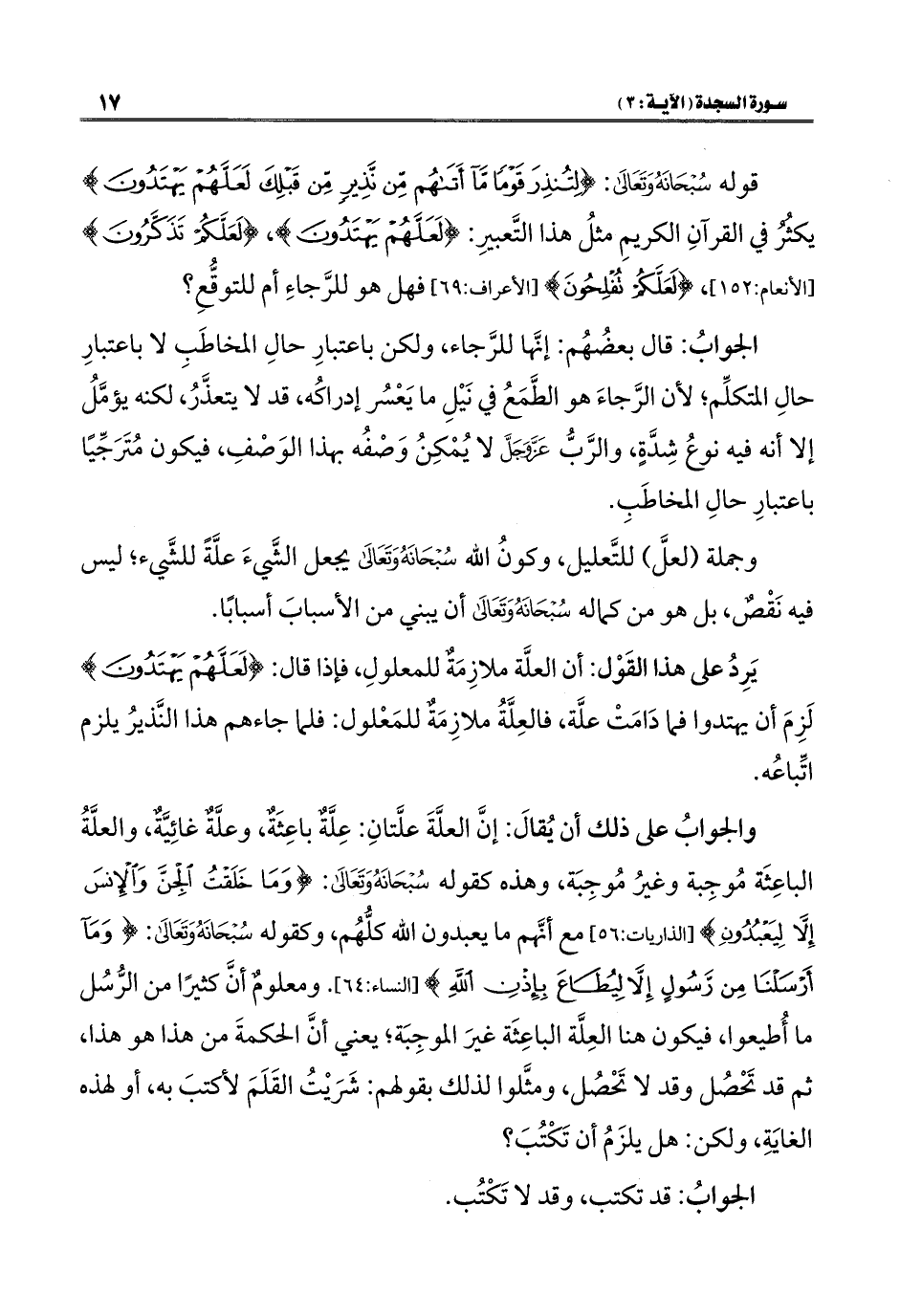 والجوابُ على ذلك أن يُقالَ: إنَّ العلَّةَ علَّتانِ: عِلَّةٌ باعِثَةٌ، وعلَّةٌ غائِيَّةٌ، والعلَّةُ الباعِثَة مُوجِبة وغيرُ مُوجِبَة، وهذه كقوله سُبْحَانَهُ وَتَعَالى: {وَمَا خَلَقْتُ الْجِنَّ وَالْإِنْسَ إِلَّا لِيَعْبُدُونِ} [الذاريات: ٥٦] مع أنَّهم ما يعبدون الله كلُّهُم، وكقوله سُبْحَانَهُ وَتَعَالَى: {وَمَا أَرْسَلْنَا مِنْ رَسُولٍ إِلَّا لِيُطَاعَ بِإِذْنِ اللَّهِ} [النساء: ٦٤]. ومعلومٌ أنَّ كثيرًا من الرُّسُل ما أُطيعوا، فيكون هنا العِلَّة الباعِثَة غيرَ الموجِبَة؛ يعني أنَّ الحكمةَ من هذا هو هذا، ثم قد تَحْصُل وقد لا تَحْصُل، ومثَّلوا لذلك بقولهم: شَرَيْتُ القَلَمَ لأكتبَ به، أو لهذه الغايَةِ، ولكن: هل يلزَمُ أن تَكْتُبَ؟