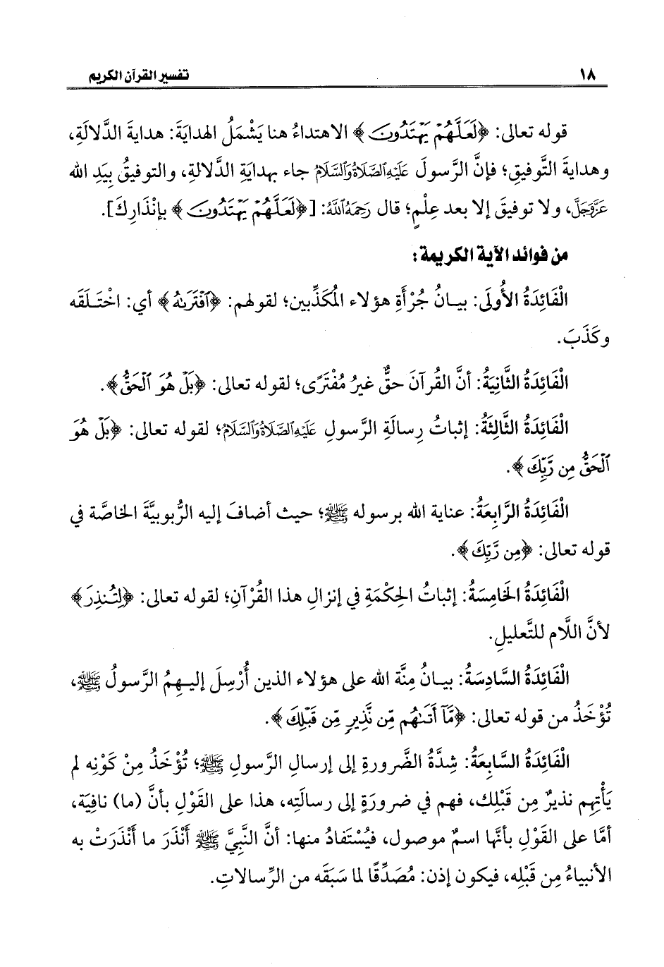 الْفَائِدَةُ السَّابِعَةُ: شِدَّةُ الضَّرورةِ إلى إرسالِ الرَّسولِ - صلى الله عليه وسلم -؛ تُؤْخَذُ مِنْ كَوْنِه لم يَأْتِهِم نذيرٌ مِن قَبْلِك، فهم في ضرورَةٍ إلى رسالَتِه، هذا على القَوْلِ بأنَّ (ما) نافِيَة، أمَّا على القَوْلِ بأنَّها اسمٌ موصول، فيُسْتَفادُ منها: أنَّ النَّبِيَّ - صلى الله عليه وسلم - أَنْذَرَ ما أَنْذَرَتْ به الأنبياءُ مِن قَبْلِه، فيكون إذن: مُصَدِّقًا لما سَبَقَه من الرِّسالاتِ.