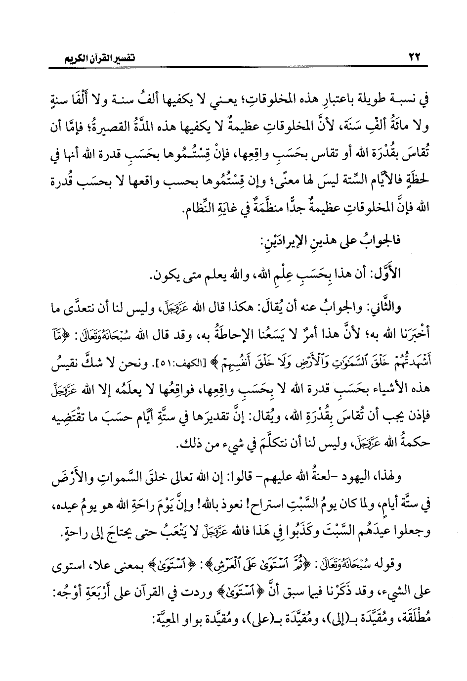 والثَّاني: والجوابُ عنه أن يُقالَ: هكذا قال الله عَزَّ وَجَلَّ، وليس لنا أن نتعدَّى ما أخْبَرَنا الله به؛ لأنَّ هذا أمرٌ لا يَسَعُنا الإحاطَةُ به، وقد قال الله سُبْحَانَهُ وَتَعَالى: {مَا أَشْهَدْتُهُمْ خَلْقَ السَّمَاوَاتِ وَالْأَرْضِ وَلَا خَلْقَ أَنْفُسِهِمْ} [الكهف: ٥١]. ونحن لا شكَّ نقيسُ هذه الأشياء بحَسَبِ قدرة الله لا بِحَسَبِ واقِعِها، فواقِعُها لا يعلَمُه إلا الله عَزَّ وَجَلَّ فإذن يجب أن تُقاسَ بِقُدْرَةِ الله، ويُقال: إنَّ تقديرَها في ستَّةِ أيَّام حسَبَ ما تقْتَضِيه حكمةُ الله عَزَّ وَجَلَّ، وليس لنا أن نتكلَّمَ في شيء من ذلك.