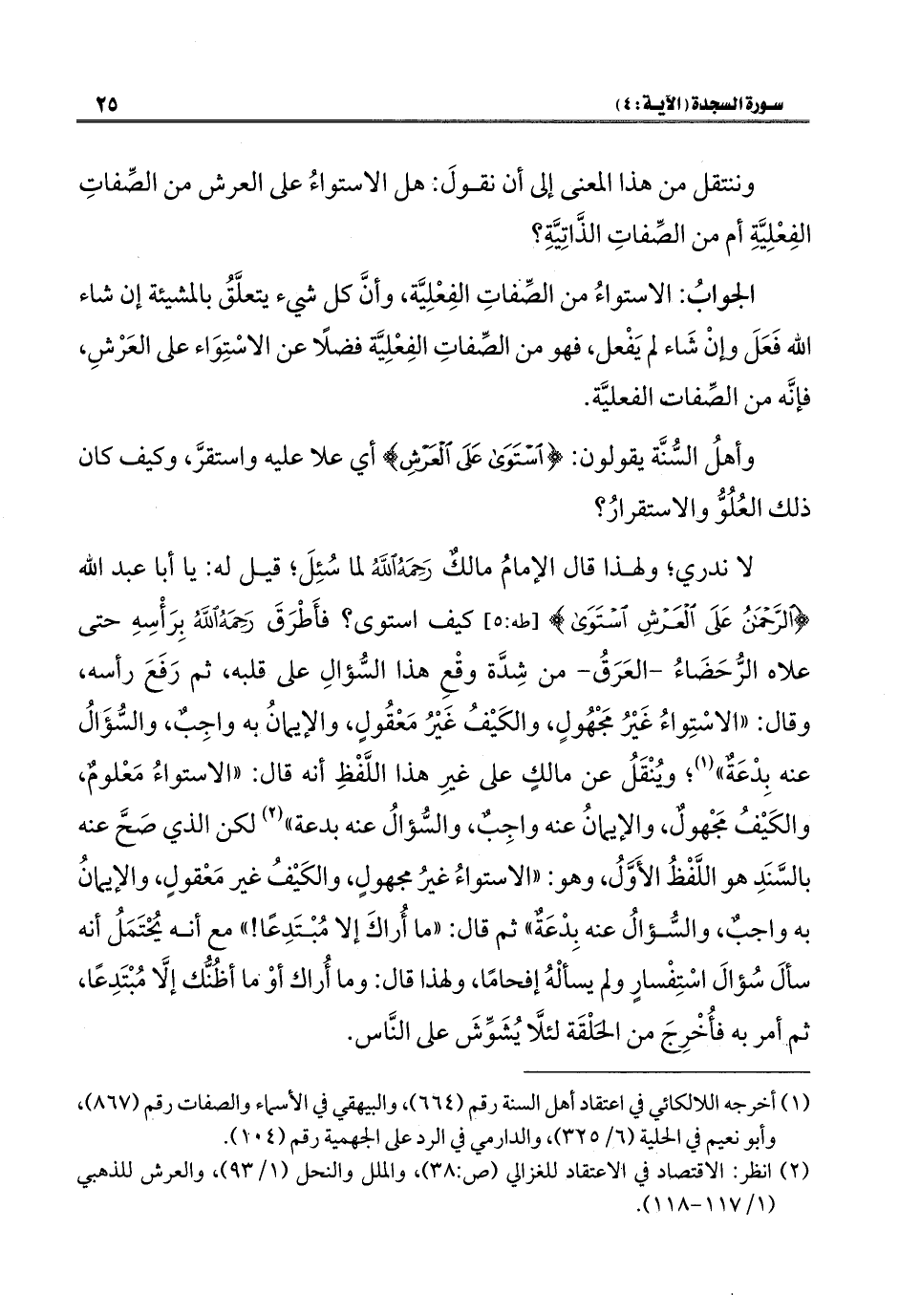 لا ندري؛ ولهذا قال الإمامُ مالكٌ رَحِمَهُ اللهُ لما سُئِلَ؛ قيل له: يا أبا عبد الله {الرَّحْمَنُ عَلَى الْعَرْشِ اسْتَوَى} [طه: ٥] كيف استوى؟ فأَطْرَقَ رَحِمَهُ الله بِرَأْسِهِ حتى علاه الرُّحَضَاءُ - العَرَقُ - من شِدَّة وقْعِ هذا السُّؤالِ على قلبه، ثم رَفَعَ رأسه، وقال: "الإسْتِواءُ غَيْرُ مَجْهُولٍ، والكَيْفُ غَيْرُ مَعْقُولٍ، والإيمانُ به واجِبٌ، والسُّؤَالُ عنه بِدْعَةٌ" (¬١)؛ ويُنْقَلُ عن مالكٍ على غيرِ هذا اللَّفْظِ أنه قال: "الإستواءُ مَعْلومٌ، والكَيْفُ مَجْهولٌ، والإيمانُ عنه واجِبٌ، والسُّؤالُ عنه بدعة" (¬٢) لكن الذي صَحَّ عنه بالسَّنَدِ هو اللَّفْظُ الأَوَّلُ، وهو: "الإستواءُ غيرُ مجهولٍ، والكَيْفُ غير مَعْقولٍ، والإيمانُ به واجبٌ، والسُّؤالُ عنه بِدْعَةٌ" ثم قال: "ما أُراكَ إلا مُبْتَدِعًا! " مع أنه يُحْتَمَلُ أنه سألَ سُؤالَ اسْتِفْسارٍ ولم يسألْهُ إفحامًا، ولهذا قال: وما أُراك أوْ ما أظُنُّك إلَّا مُبْتَدِعًا، ثم أمر به فأُخْرِجَ من الحَلْقَة لئلَّا يُشَوِّشَ على النَّاس.