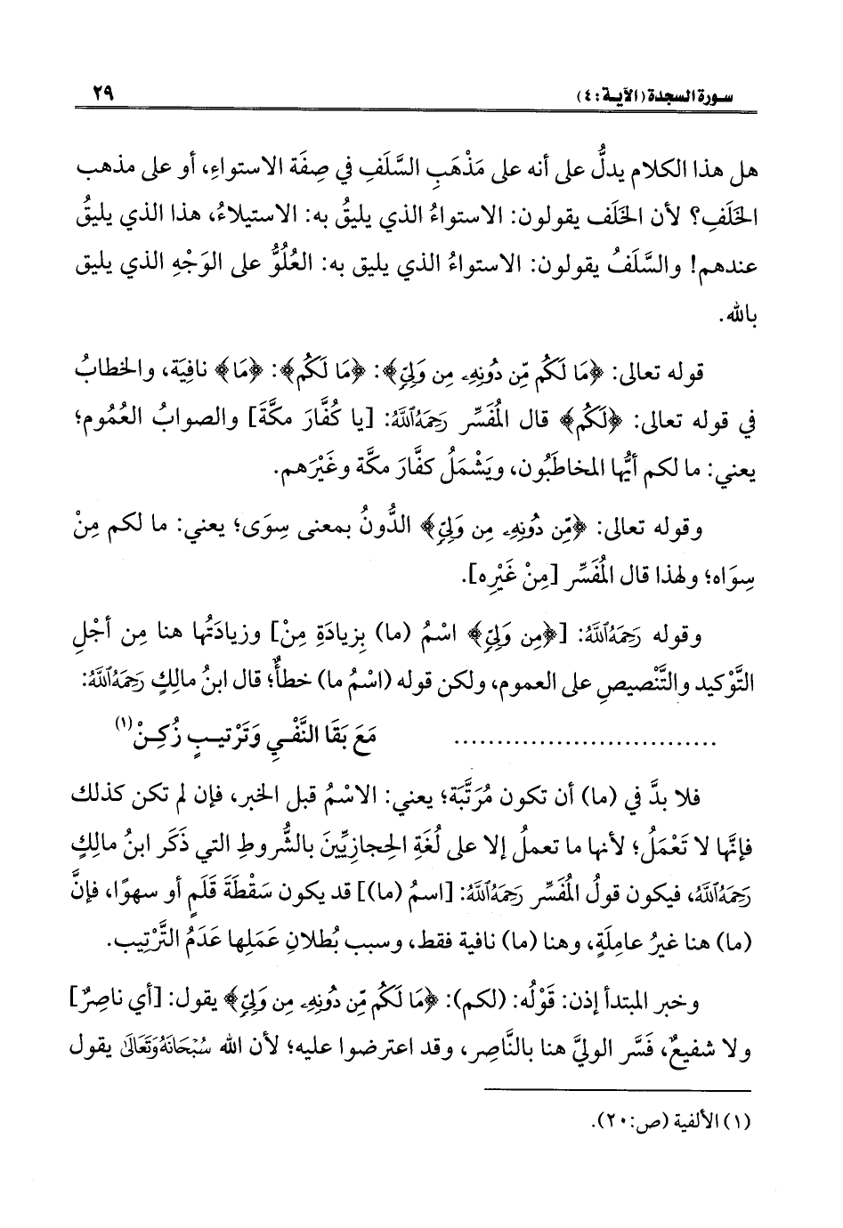 وقوله رَحِمَهُ اللهُ: [{مِنْ وَلِيٍّ} اسْمُ (ما) بِزيادَةِ مِنْ] وزيادَتُها هنا مِن أجْلِ التَّوْكيد والتَّنْصيصِ على العموم، ولكن قوله (اسْمُ ما) خطأٌ؛ قال ابنُ مالِكٍ رَحِمَهُ الله: