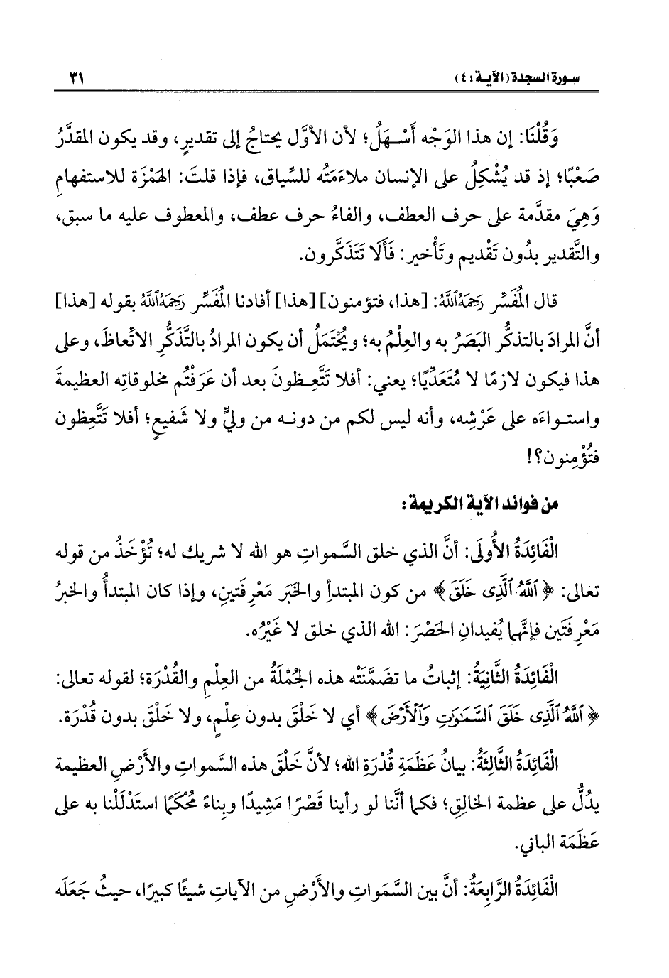 قال المُفَسِّر رَحِمَهُ الله: [هذا، فتؤمنون] [هذا] أفادنا المُفَسِّر رَحِمَهُ اللهُ بقوله [هذا] أنَّ المرادَ بالتذكُّر البَصَرُ به والعِلْمُ به؛ ويُحْتَمَلُ أن يكون المرادُ بالتَّذَكُّرِ الإتِّعاظَ، وعلى هذا فيكون لازمًا لا مُتَعَدِّيًا؛ يعني: أفلا تَتَّعِظونَ بعد أن عَرَفْتُم مخلوقاتِه العظيمةَ واستواءَه على عَرْشِه، وأنه ليس لكم من دونه من وليٍّ ولا شَفيعٍ؛ أفلا تَتَّعِظون فتُؤْمِنون؟ !