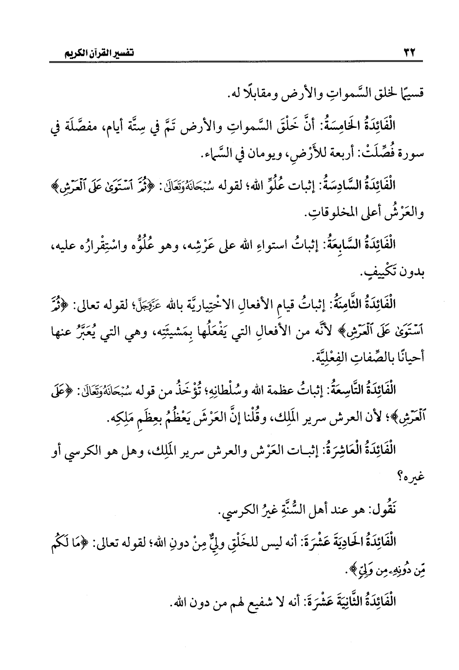 الْفَائِدَةُ السَّابِعَةُ: إثباتُ استواءِ الله على عَرْشِه، وهو عُلُوُّه واسْتِقْرارُه عليه، بدون تَكْييفٍ.