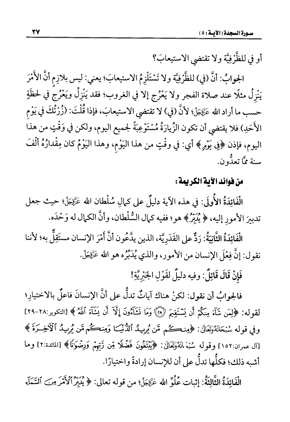 الجوابُ: أنَّ (في) للظَّرْفِيَّة ولا تَسْتَلْزِمُ الإستيعابَ؛ يعني: ليس بلازِمٍ أنَّ الأَمْرَ يَنْزِلُ مثلًا عند صلاة الفجر ولا يَعْرُج إلا في الغروب؛ فقد يَنْزِلُ ويَعْرُج في لحظَةٍ حسب ما أراد الله عَزَّ وَجَلَّ؛ لأنَّ (في) لا تقتضي الإستيعابَ، فإذا قُلْتَ: (زُرْتُكَ في يَوْمِ الأَحَدِ) فلا يقتضي أن تكون الزِّيارَةُ مُسْتَوْعِبَةً لجميع اليوم، ولكن في وَقْتٍ من هذا اليوم، فإذن {فِي يَوْمٍ} أي: في وقْتٍ من هذا اليَوْمِ، وهذا اليَوْمُ كان مِقْدارُهُ ألْفَ سنة ممَّا تعدُّون.