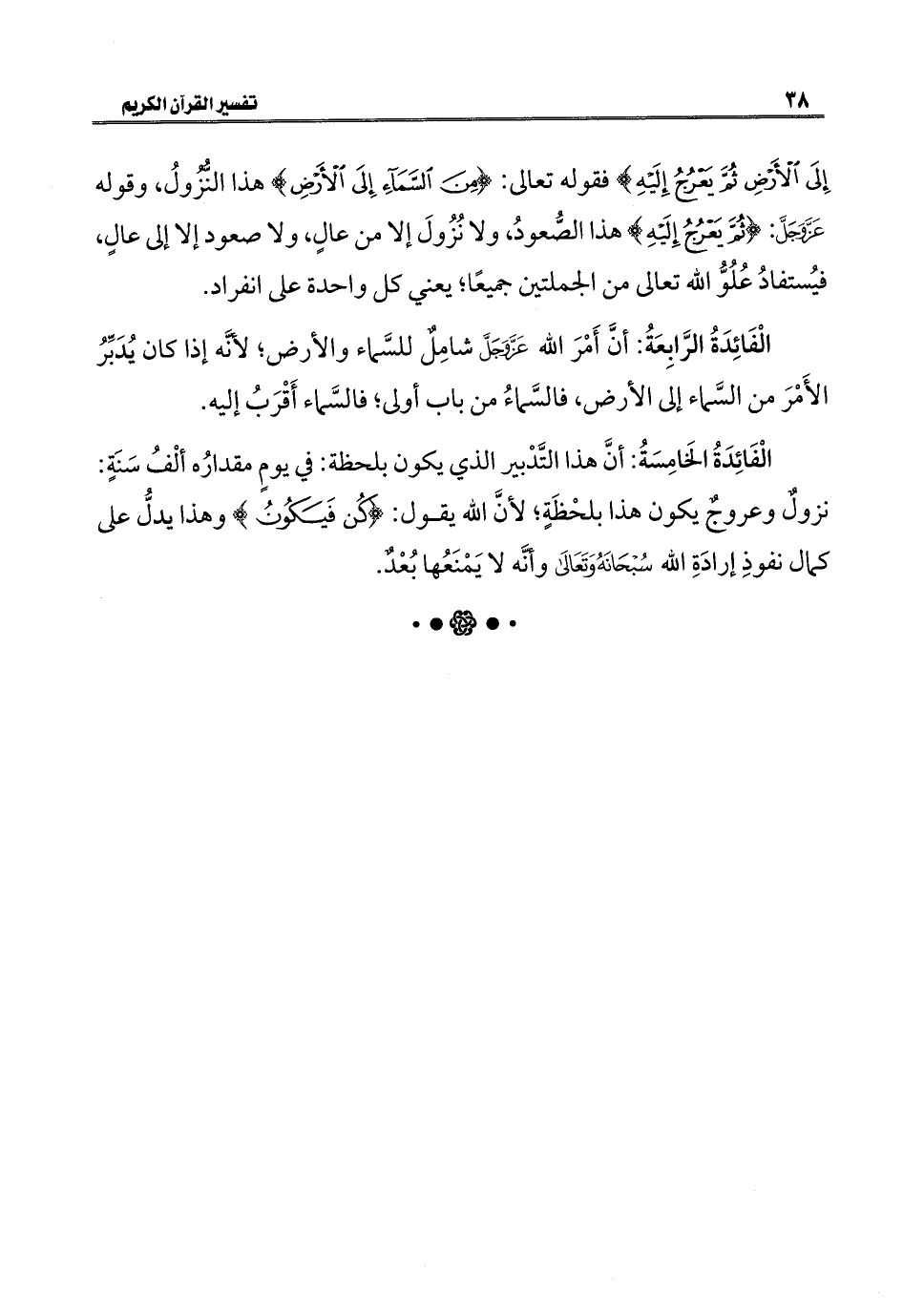 الْفَائِدَةُ الخَامِسَةُ: أنَّ هذا التَّدْبير الذي يكون بلحظة: في يومٍ مقدارُه ألْفُ سَنَةٍ: نزولٌ وعروجٌ يكون هذا بلحْظَةٍ؛ لأنَّ الله يقول: {كُنْ فَيَكُونُ} وهذا يدلُّ على كمال نفوذِ إرادَةِ الله سُبْحَانَهُ وَتَعَالَى وأنَّه لا يَمْنَعُها بُعْدٌ.