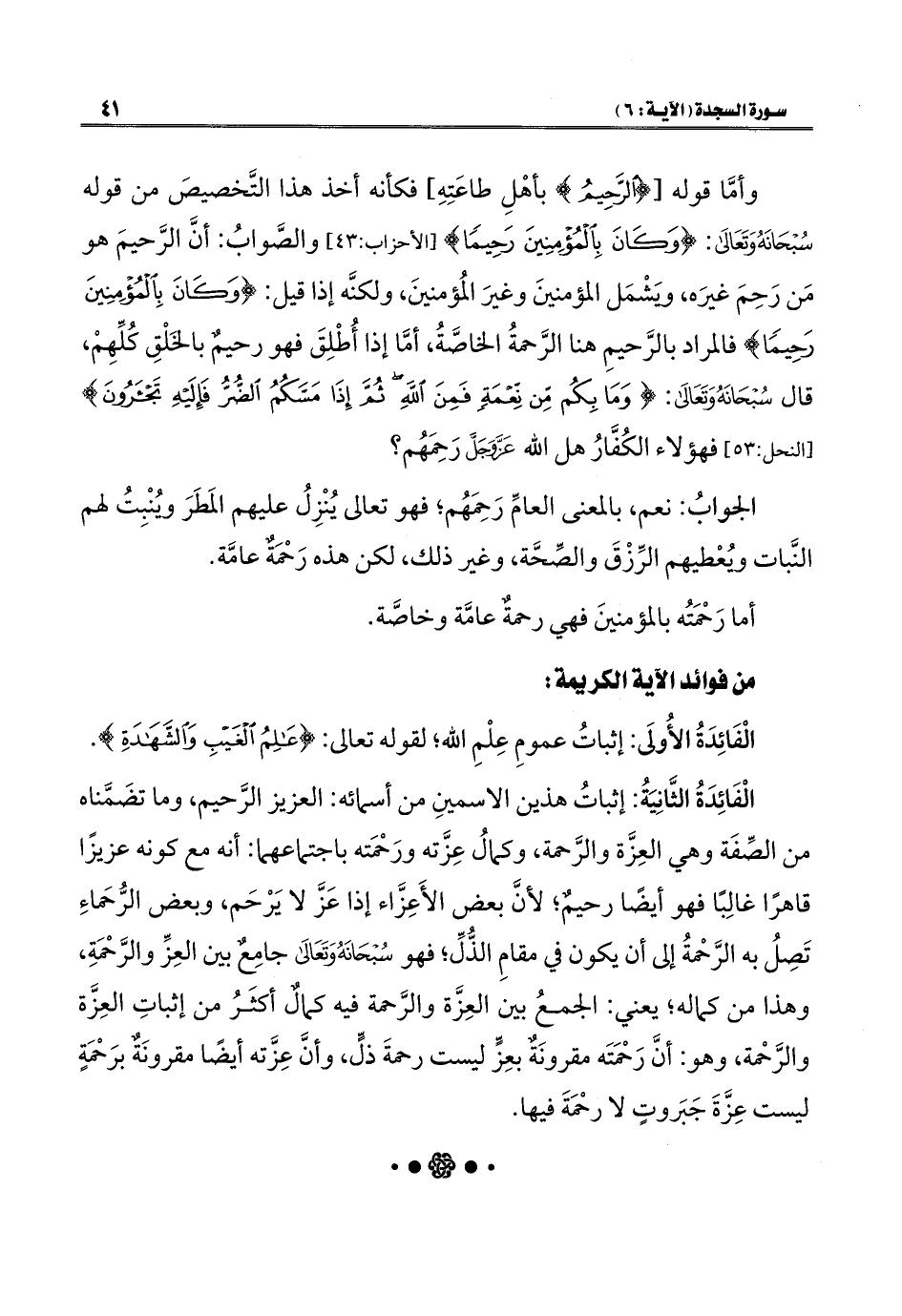 الْفَائِدَةُ الثَّانِيَةُ: إثباتُ هذين الإسمينِ من أسمائه: العزيز الرَّحيم، وما تضَمَّناه من الصِّفَة وهي العِزَّة والرَّحمة، وكمالُ عِزَّته ورَحْمَته باجتماعهما: أنه مع كونه عزيزًا قاهرًا غالِبًا فهو أيضًا رحيمٌ؛ لأنَّ بعض الأَعِزَّاء إذا عَزَّ لا يَرْحَم، وبعض الرُّحَماءِ تَصِلُ به الرَّحْمةُ إلى أن يكون في مقامِ الذُّلِّ؛ فهو سُبْحَانَهُ وَتَعَالَى جامِعٌ بين العِزِّ والرَّحْمَةِ، وهذا من كماله؛ يعني: الجمعُ بين العِزَّة والرَّحمة فيه كمالٌ أكثَرُ من إثباتِ العِزَّة والرَّحْمة، وهو: أنَّ رَحْمَتَه مقرونَةٌ بعِزٍّ ليست رحمةَ ذلٍّ، وأنَّ عِزَّته أيضًا مقرونَةٌ برَحْمَةٍ ليست عِزَّةَ جَبَروتٍ لا رحْمَةَ فيها.
