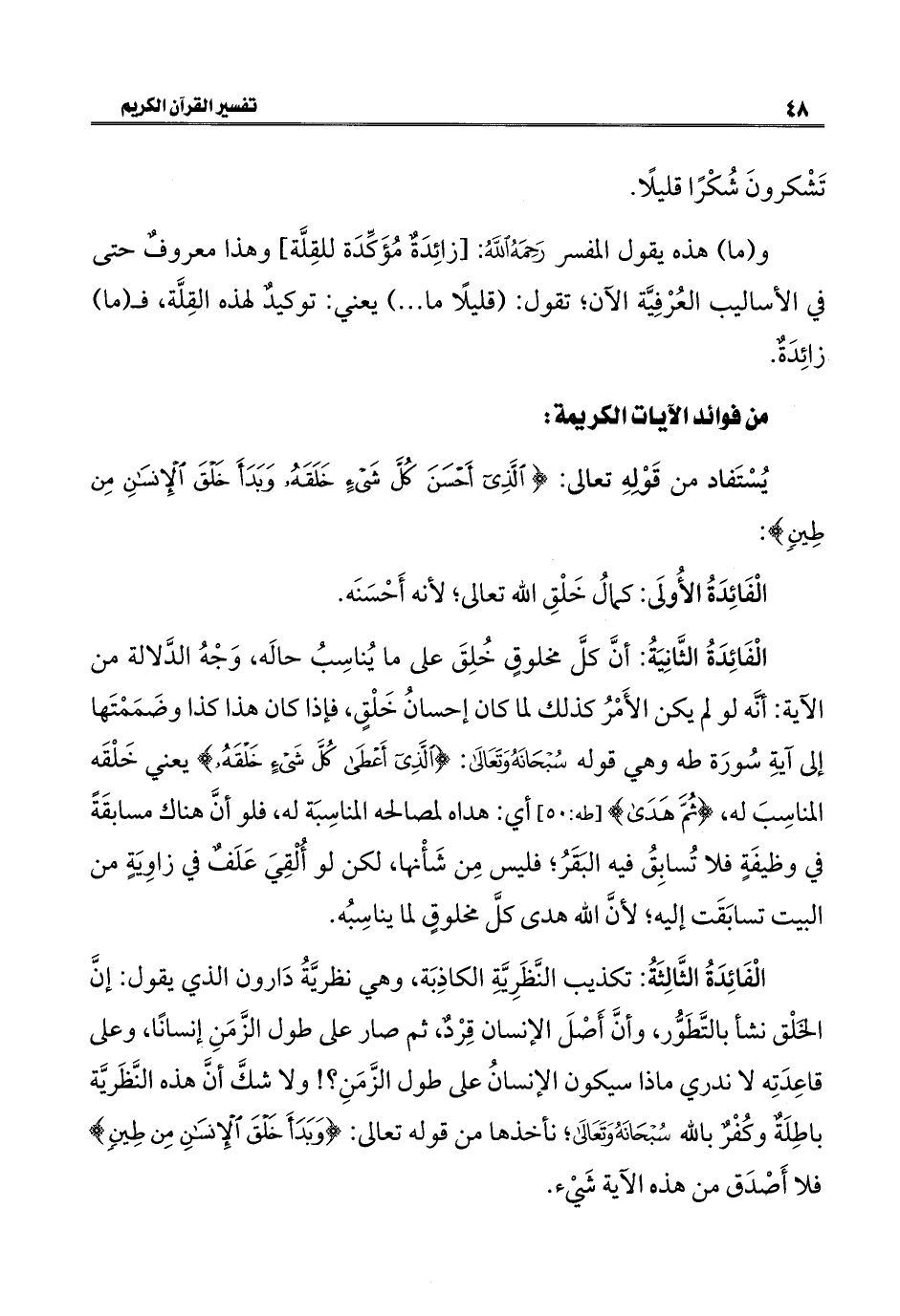 الْفَائِدَةُ الثَّالِثَةُ: تكذيب النَّظَرِيَّةِ الكاذِبَة، وهي نظريَّةُ دَارون الذي يقول: إنَّ الخَلْق نشأ بالتَّطَوُّر، وأنَّ أَصْلَ الإنسان قِرْدٌ، ثم صار على طول الزَّمَنِ إنسانًا، وعلى قاعِدَتِه لا ندري ماذا سيكون الإنسانُ على طول الزَّمَنِ؟ ! ولا شكَّ أنَّ هذه النَّظَريَّة باطِلَةٌ وكُفْرٌ بالله سُبْحَانَهُ وَتَعَالَى؛ نأخذها من قوله تعالى {وَبَدَأَ خَلْقَ الْإِنْسَانِ مِنْ طِينٍ} فلا أَصْدَق من هذه الآية شَيْء.