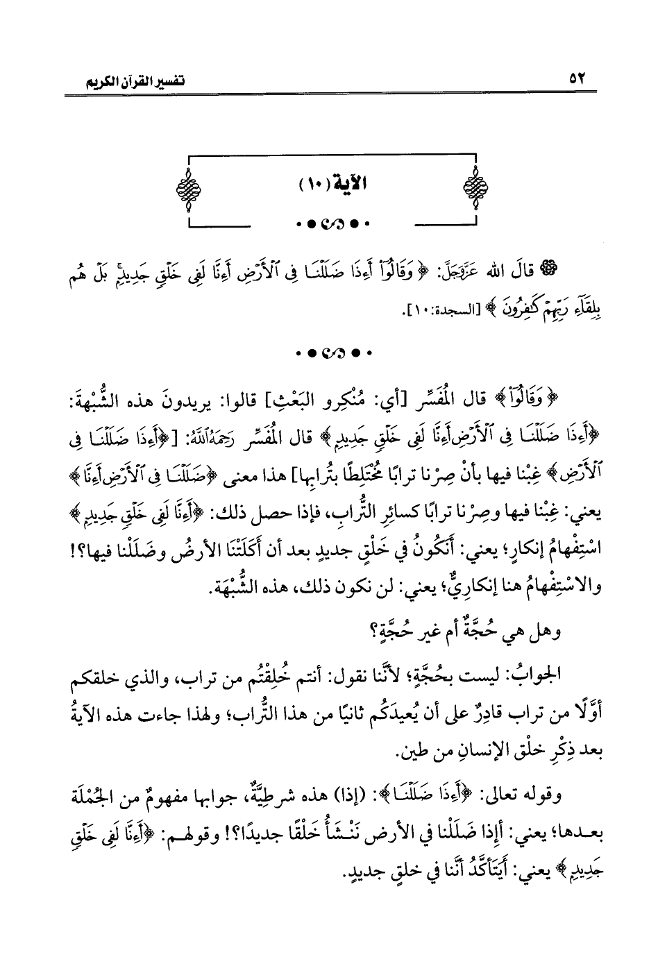{وَقَالُوا} قال المُفَسِّر [أي: مُنْكِرو البَعْثِ] قالوا: يريدونَ هذه الشُّبْهةَ: {أَإِذَا ضَلَلْنَا فِي الْأَرْضِ أَإِنَّا لَفِي خَلْقٍ جَدِيدٍ} قال المُفَسِّر رَحِمَهُ اللَّهُ: [{أَإِذَا ضَلَلْنَا فِي الْأَرْضِ} غِبْنا فيها بأنْ صِرْنا ترابًا مُخْتَلِطًا بتُرابِها] هذا معنى {أَإِذَا ضَلَلْنَا فِي الْأَرْضِ أَإِنَّا} يعني: غِبْنا فيها وصِرْنا ترابًا كسائِرِ التُّرابِ، فإذا حصل ذلك: {أَإِنَّا لَفِي خَلْقٍ جَدِيدٍ} اسْتِفْهامُ إنكارٍ؛ يعني: أَنَكُونُ في خَلْقٍ جديدٍ بعد أن أَكَلَتْنَا الأرضُ وضَلَلْنا فيها؟ ! والإسْتِفْهامُ هنا إنكارِيٌّ؛ يعني: لن نكون ذلك، هذه الشُّبْهَة.