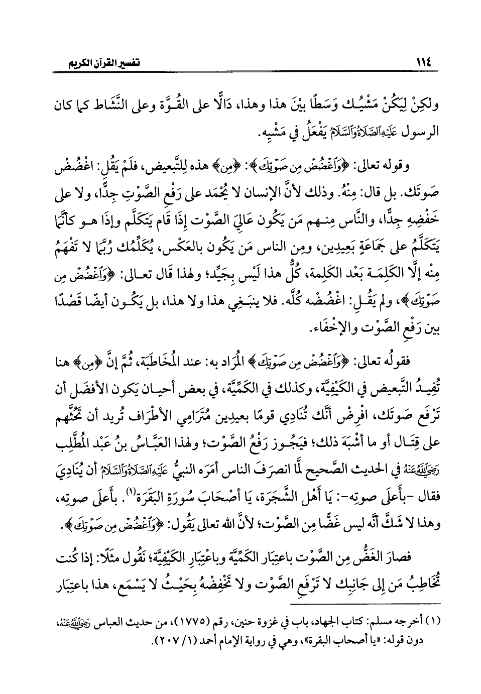 فقولُه تعالى: {وَاغْضُضْ مِنْ صَوْتِكَ} المُرَاد به: عند المُخَاطَبَة، ثُمَّ إنَّ {مِنْ} هنا تُفِيدُ التَّبعيض في الكَيْفِيَّة، وكذلك في الكَمِّيَّة، في بعض أحيان يَكون الأفضَل أن تَرْفَع صَوتَك، افْرِضْ أنَّك تُنَادِي قومًا بعيدِين مُتَرَامِي الأطْرَاف تُريد أن تحثَّهم على قِتَال أو ما أشْبَهَ ذلك؛ فيَجُوز رَفْعُ الصَّوْت؛ ولهذا العَبَّاسُ بنُ عَبْد المُطَّلِب -رضي اللَّه عنه- في الحديث الصَّحيح لمَّا انصرَفَ الناس أمَرَه النبيُّ عَلَيْهِ الصَّلَاةُ وَالسَّلَامُ أن يُنَادِيَ فقال -بأَعلَى صوتِه-: يَا أَهْل الشَّجَرَة، يَا أصْحَابَ سُورَةِ البَقَرَة (¬١). بأَعلَى صوتِه، وهذا لا شَكَّ أنَّه ليس غَضًّا مِن الصَّوْت؛ لأنَّ اللَّه تعالى يَقُول: {وَاغْضُضْ مِنْ صَوْتِكَ}.