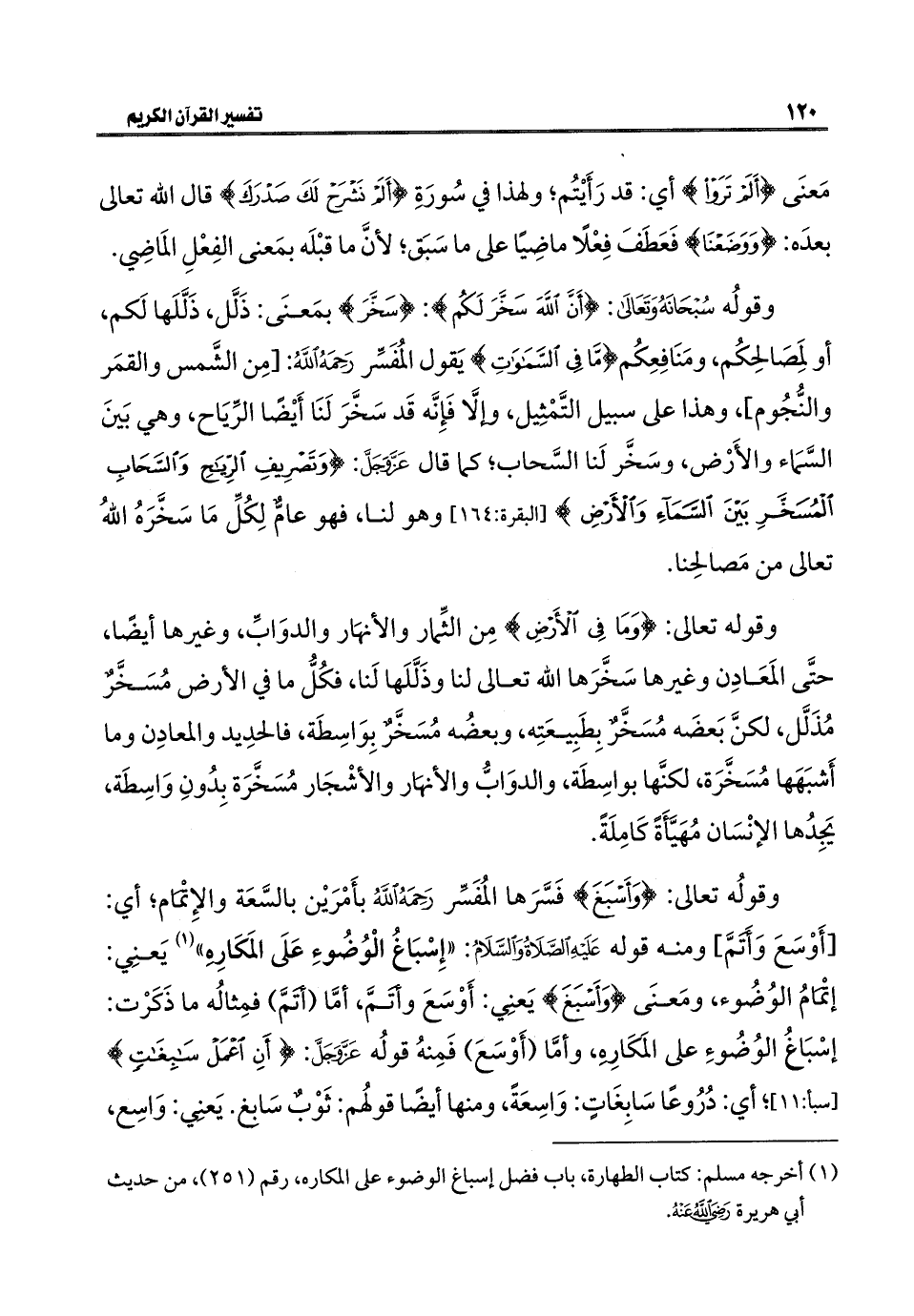 وقولُه تعالى: {وَأَسْبَغَ} فَسَّرَها المُفَسِّر رَحِمَهُ اللَّه بأَمْرَيْن بالسَّعَة والإتمام؛ أي: [أَوْسَعَ وَأتمَّ] ومنه قوله عَلَيْهِ الصَّلَاةُ وَالسَّلَامُ: "إِسْبَاغُ الْوُضُوءِ عَلَى المَكَارِهِ" (¬١) يَعنِي: إتْمَامُ الوُضُوء، ومَعنَى {وَأَسْبَغَ} يَعنِي: أَوْسَعَ وأتمَّ، أمَّا (أتمَّ) فمِثالُه ما ذَكَرْت: إسْبَاغُ الوُضُوءِ على المَكَاره، وأمَّا (أَوْسَعَ) فَمِنهُ قولُه عَزَّ وَجَلَّ: {أَنِ اعْمَلْ سَابِغَاتٍ} [سبأ: ١١]؛ أي: دُرُوعًا سَابِغَاتٍ: وَاسِعَةً، ومنها أيضًا قولُهم: ثَوْبٌ سَابغ. يَعني: وَاسِع،