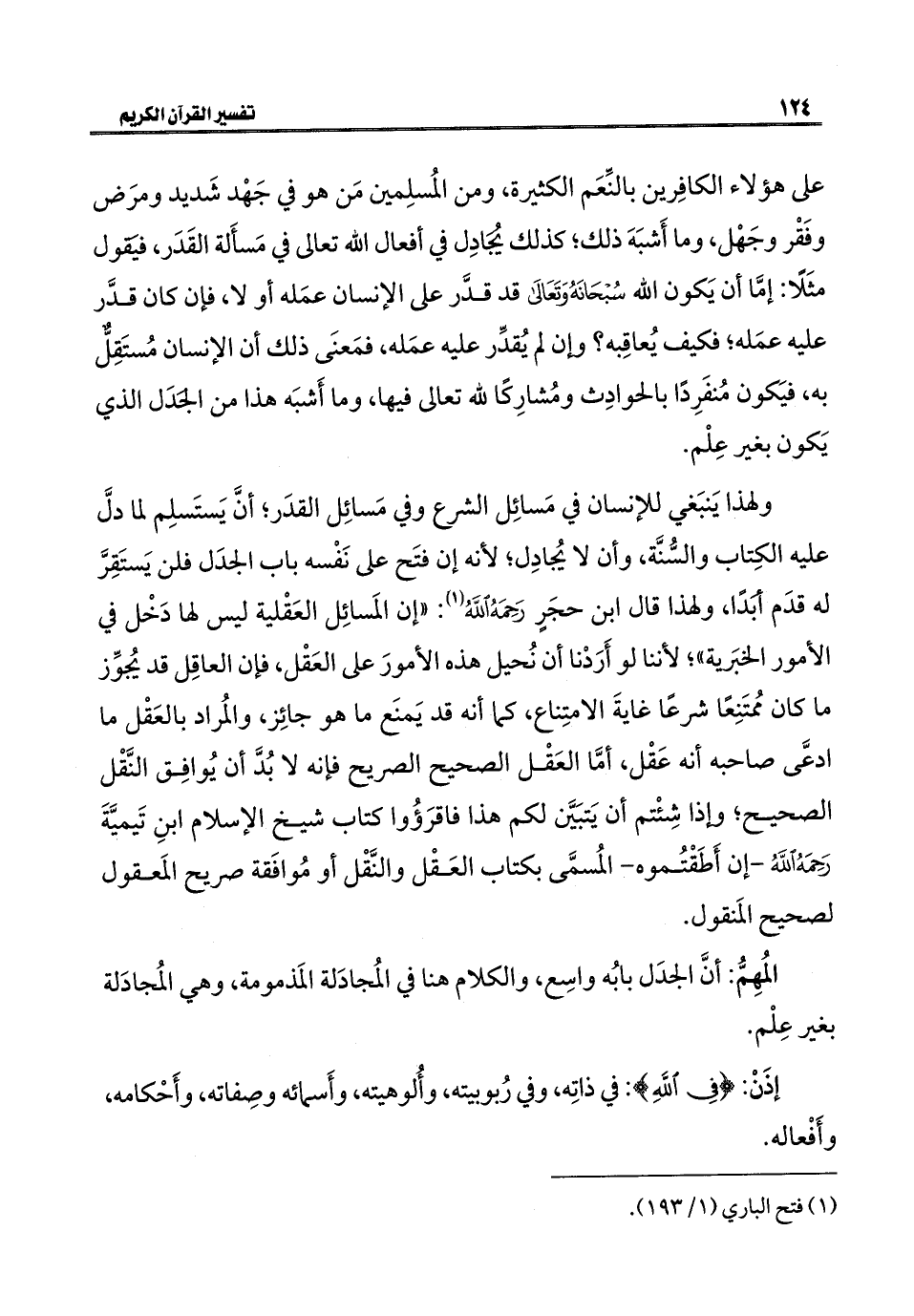 على هؤلاء الكافِرين بالنِّعَم الكثيرة، ومن المُسلِمين مَن هو في جَهْد شَديد ومرَض وفَقْر وجَهْل، وما أَشبَهَ ذلك؛ كذلك يُجادِل في أفعال اللَّه تعالى في مَسأَلة القَدَر، فتقول مثَلًا: إمَّا أن يَكون اللَّه سُبْحَانَهُ وَتَعَالَى قد قدَّر على الإنسان عمَله أو لا، فإن كان قدَّر عليه عمَله؛ فكيف يُعاقِبه؟ وإن لم يُقدِّر عليه عمَله، فمَعنَى ذلك أن الإنسان مُستَقِلٌّ به، فيَكون مُنفَرِدًا بالحوادِث ومُشارِكًا للَّه تعالى فيها، وما أَشبَه هذا من الجدَل الذي يَكون بغير عِلْم.