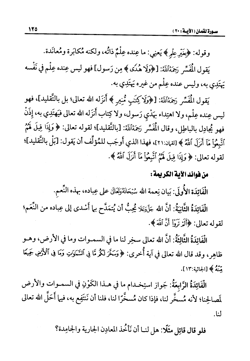 يَقول المُفَسر رَحِمَهُ اللَّهُ: [{وَلَا كِتَابٍ مُنِيرٍ} أَنزَله اللَّه تعالى؛ بل بالتَّقليد]، فهو ليس عِنده عِلْم، ولا اهتِداء بهَدْيِ رَسول، ولا كِتاب أَنزَله اللَّه تعالى فيَهتَدِي به، إِذَنْ فهو يُجادِل بالباطِل، وقال المُفَسِّر رَحِمَهُ اللَّهُ: [بالتَّقليد]؛ لقوله تعالى: {وَإِذَا قِيلَ لَهُمُ اتَّبِعُوا مَا أَنْزَلَ اللَّهُ} [لقمان: ٢١]، فهذا الذي أَوجَب للمُؤلِّف أن يَقول: [بلْ بالتَّقليد]؛ لقوله تعالى: {وَإِذَا قِيلَ لَهُمُ اتَّبِعُوا مَا أَنْزَلَ اللَّهُ}.