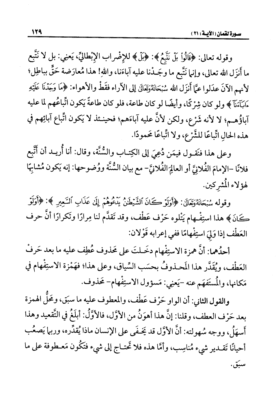 وقوله تعالى: {قَالُوا بَلْ نَتَّبِعُ}: {بَلْ} للإِضْراب الإِبْطاليِّ، يَعنِي: بل لا نَتَّبع ما أَنزَل اللَّه تعالى، وإنما نَتَّبع ما وجَدْنا عليه آباءَنا، واللَّهِ! هذا مُعارَضة حَقٍّ بباطِل؛ لأنهم الآنَ عدَلوا عمَّا أَنزَل اللَّه سُبْحَانَهُ وَتَعَالَى إلى الآراء فقَطْ والأهواء: {مَا وَجَدْنَا عَلَيْهِ آبَاءَنَا} ولو كان شِرْكًا، وأيضًا لو كان طاعة، فلو كان طاعةً يَكون اتِّباعُهم لما عليه آباؤُهم؛ لا لأنه شَرْع، ولكن لأنَّ عليه آباءَهم؛ فحينئذ لا يَكون اتِّباع آبائِهم في هذه الحالِ اتِّباعًا للشَّرْع، ولا اتِّباعًا محَمودًا.