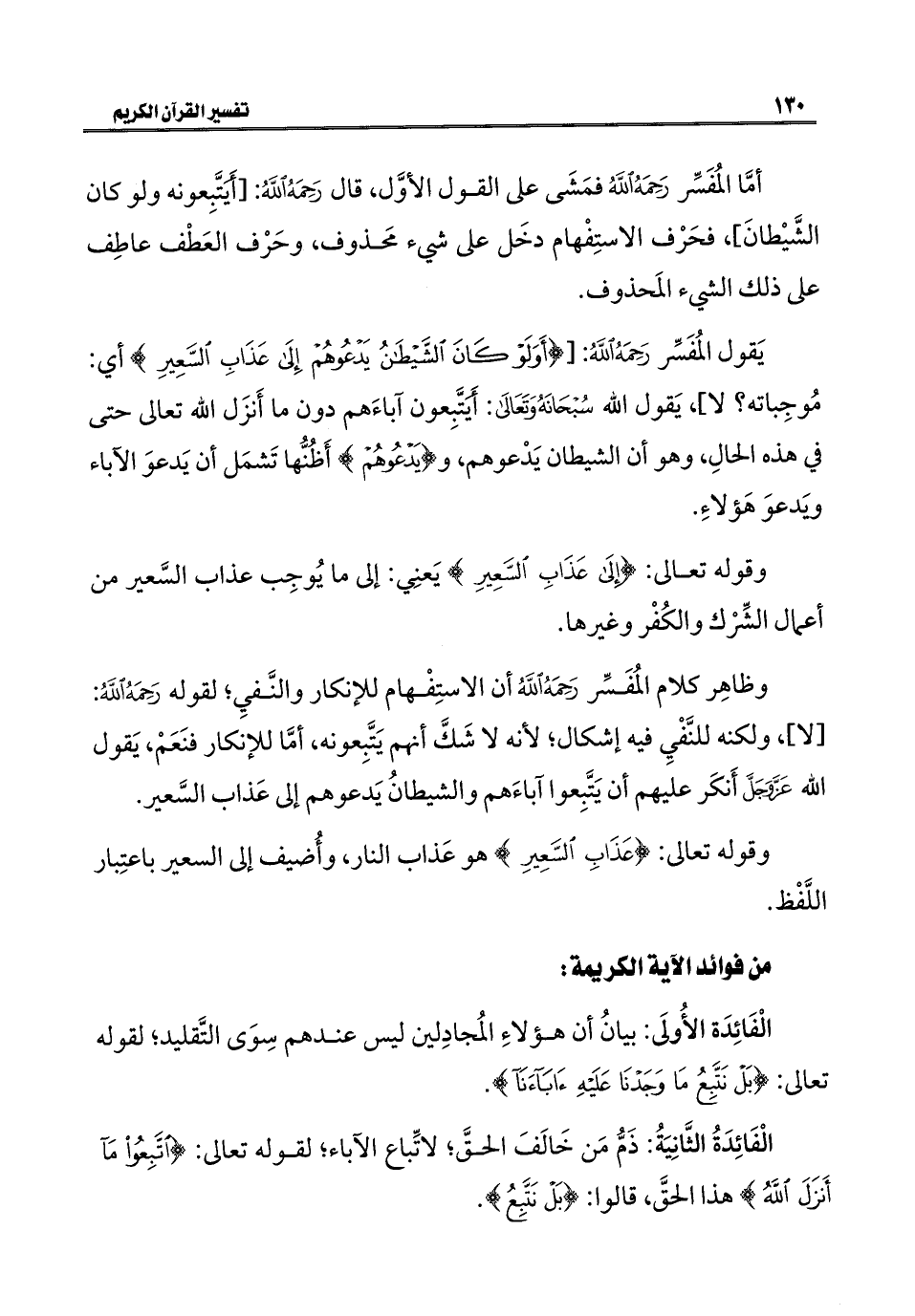 يَقول المُفَسِّر رَحِمَهُ اللَّهُ: [{أَوَلَوْ كَانَ الشَّيْطَانُ يَدْعُوهُمْ إِلَى عَذَابِ السَّعِيرِ} أي: مُوجِباته؟ لا]، يَقول اللَّه سُبْحَانَهُ وَتَعَالَى: أيتَّبِعون آباءَهم دون ما أَنزَل اللَّه تعالى حتى في هذه الحالِ، وهو أن الشيطان يَدْعوهم، {يَدْعُوهُمْ} أَظُنُّها تَشمَل أن يَدعوَ الآباء ويَدعوَ هَؤلاءِ.