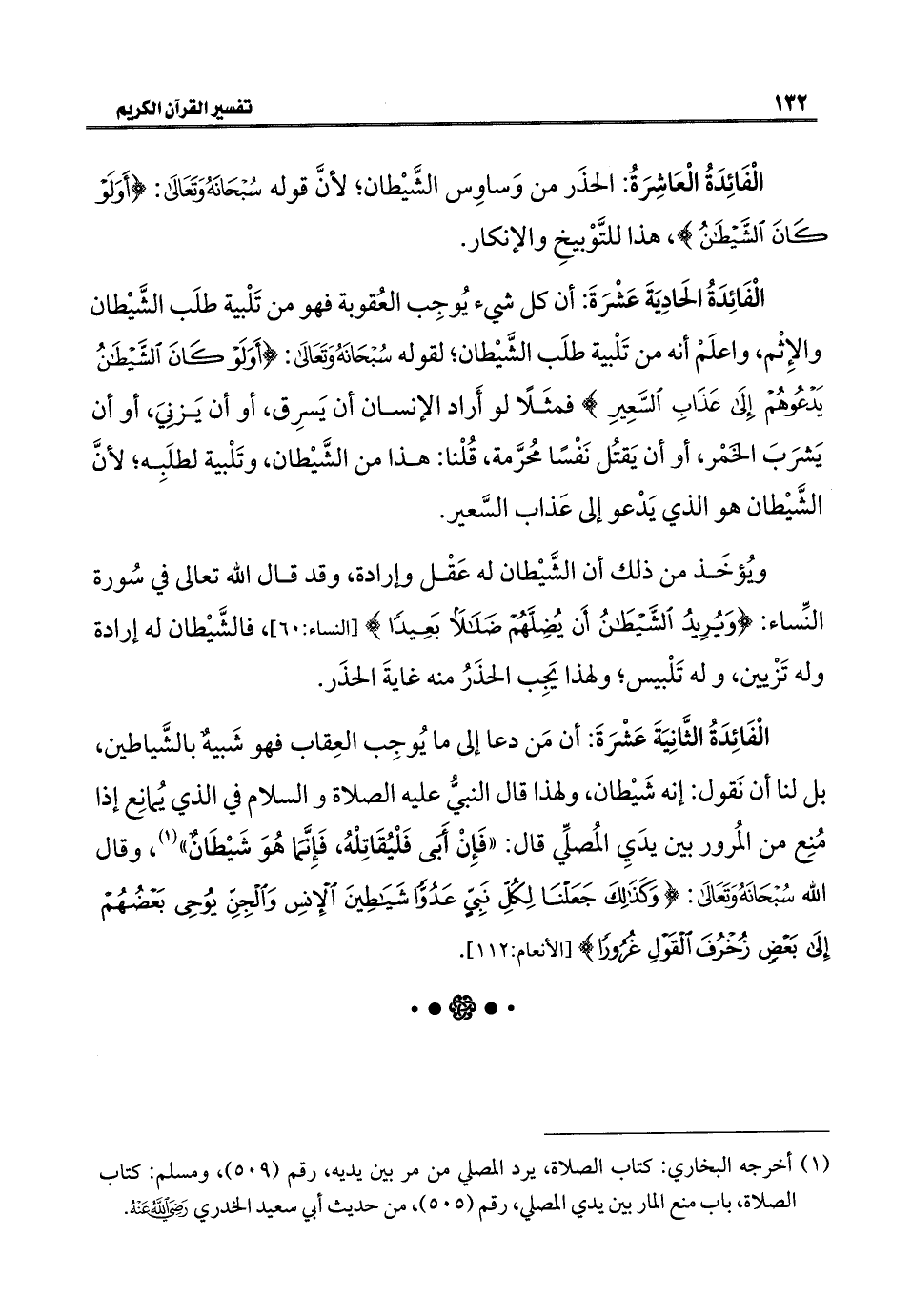 الْفَائِدَةُ الثَّانِيَةَ عَشْرَةَ: أن مَن دعا إلى ما يُوجِب العِقاب فهو شَبيهٌ بالشَّياطين، بل لنا أن نَقول: إنه شَيْطان، ولهذا قال النبيُّ عليه الصلاة والسلام في الذي يُمانِع إذا مُنِع من المُرور بين يدَيِ المُصلِّي قال: "فَإِنْ أَبَى فَلْيُقَاتِلْهُ، فَإِنَّمَا هُوَ شَيْطَانٌ" (¬١)، وقال اللَّه سُبْحَانَهُ وَتَعَالَى: {وَكَذَلِكَ جَعَلْنَا لِكُلِّ نَبِيٍّ عَدُوًّا شَيَاطِينَ الْإِنْسِ وَالْجِنِّ يُوحِي بَعْضُهُمْ إِلَى بَعْضٍ زُخْرُفَ الْقَوْلِ غُرُورًا} [الأنعام: ١١٢].
