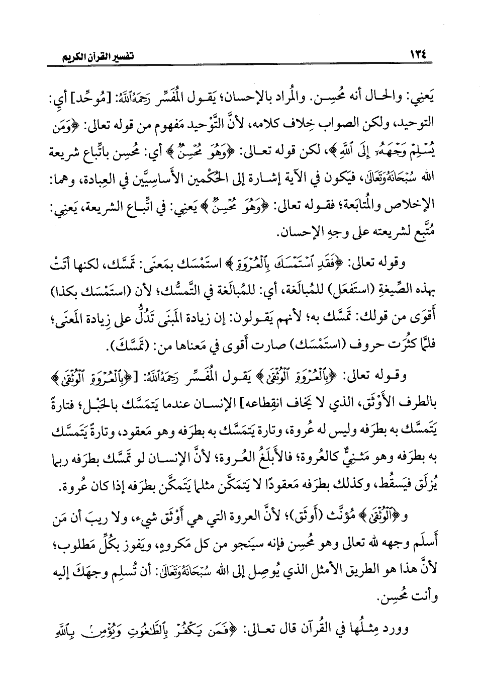 وقوله تعالى: {بِالْعُرْوَةِ الْوُثْقَى} يَقول المُفَسِّر رَحِمَهُ اللَّهُ: [{بِالْعُرْوَةِ الْوُثْقَى} بالطرف الأَوْثَق، الذي لا يَخاف انقِطاعه، الإنسان عندما يَتمَسَّك بالحبْل، فتارةً يَتَمسَّك به بطرَفه وليس له عُروة، وتارة يَتمَسَّك به بطرَفه وهو مَعقود، وتارةً يَتَمسَّك به بطرَفه وهو مَثنِيٌّ كالعُروة؛ فالأَبلَغُ العُروة؛ لأنَّ الإنسان لو تمَسَّك بطرَفه ربما يُزلَق فيَسقُط، وكذلك بطرَفه مَعقودًا لا يَتمَكَّن مثلما يَتَمكَّن بطرَفه إذا كان عُروة.