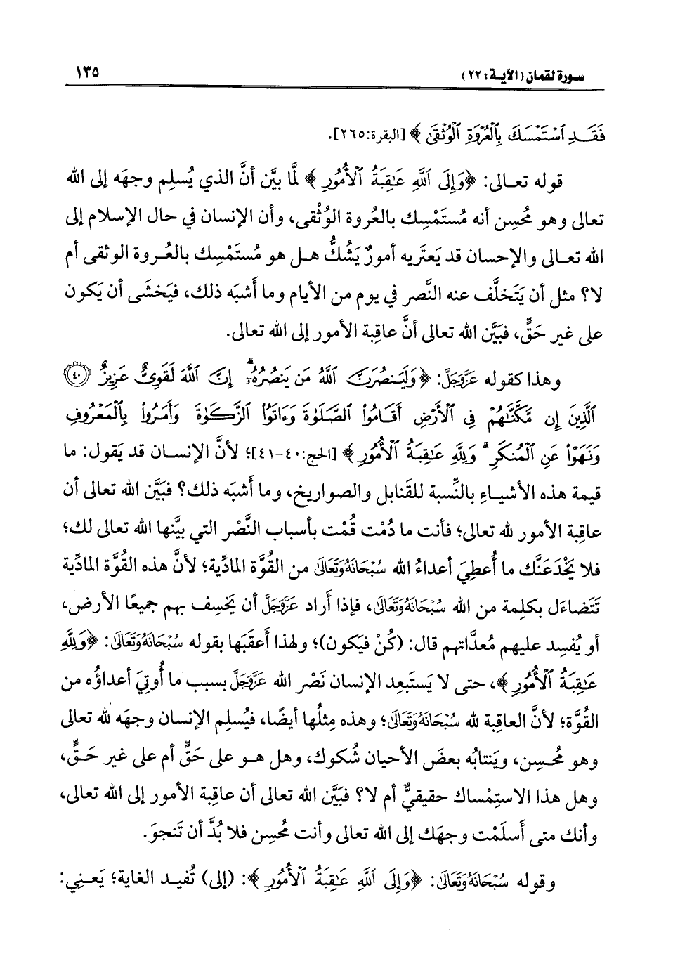 وهذا كقوله عَزَّ وَجَلَّ: {وَلَيَنْصُرَنَّ اللَّهُ مَنْ يَنْصُرُهُ إِنَّ اللَّهَ لَقَوِيٌّ عَزِيزٌ (٤٠) الَّذِينَ إِنْ مَكَّنَّاهُمْ فِي الْأَرْضِ أَقَامُوا الصَّلَاةَ وَآتَوُا الزَّكَاةَ وَأَمَرُوا بِالْمَعْرُوفِ وَنَهَوْا عَنِ الْمُنْكَرِ وَلِلَّهِ عَاقِبَةُ الْأُمُورِ (٤١)} [الحج: ٤٠ - ٤١]؛ لأنَّ الإنسان قد يَقول: ما قيمة هذه الأشياءِ بالنِّسبة للقَنابل والصواريخ، وما أَشبَه ذلك؟ فبَيَّن اللَّه تعالى أن عاقِبة الأمور للَّه تعالى؛ فأنت ما دُمْت قُمْت بأسباب النَّصْر التي بيَّنها اللَّه تعالى لك؛ فلا يَخْدَعَنَّك ما أُعطِيَ أعداءُ اللَّه سُبْحَانَهُ وَتَعَالَى من القُوَّة المادِّية؛ لأنَّ هذه القُوَّة المادِّية تَتَضاءَل بكلِمة من اللَّه سُبْحَانَهُ وَتَعَالَى، فإذا أَراد عَزَّ وَجَلَّ أن يَخسِف بهم جميعًا الأرض، أو يُفسِد عليهم مُعدَّاتهم قال: (كُنْ فيَكون)، ولهذا أَعقَبَها بقوله سُبْحَانَهُ وَتَعَالَى: {وَلِلَّهِ عَاقِبَةُ الْأُمُور}، حتى لا يَستَبعِد الإنسان نَصْر اللَّه عَزَّ وَجَلَّ بسبب ما أُوتِيَ أعداؤُه من القُوَّة؛ لأنَّ العاقِبة للَّه سُبْحَانَهُ وَتَعَالَى؛ وهذه مِثلُها أيضًا، فيُسلِم الإنسان وجهَهْ للَّه تعالى وهو مُحسِن، ويَنتابُه بعضَ الأحيان شُكوك، وهل هو على حَقٍّ أم على غير حَقٍّ، وهل هذا الاستِمْساك حقيقيٌّ أم لا؛ فبَيَّن اللَّه تعالى أن عاقِبة الأمور إلى اللَّه تعالى، وأنك متى أَسلَمْت وجهَك إلى اللَّه تعالى وأنت مُحسِن فلا بُدَّ أن تَنجوَ.