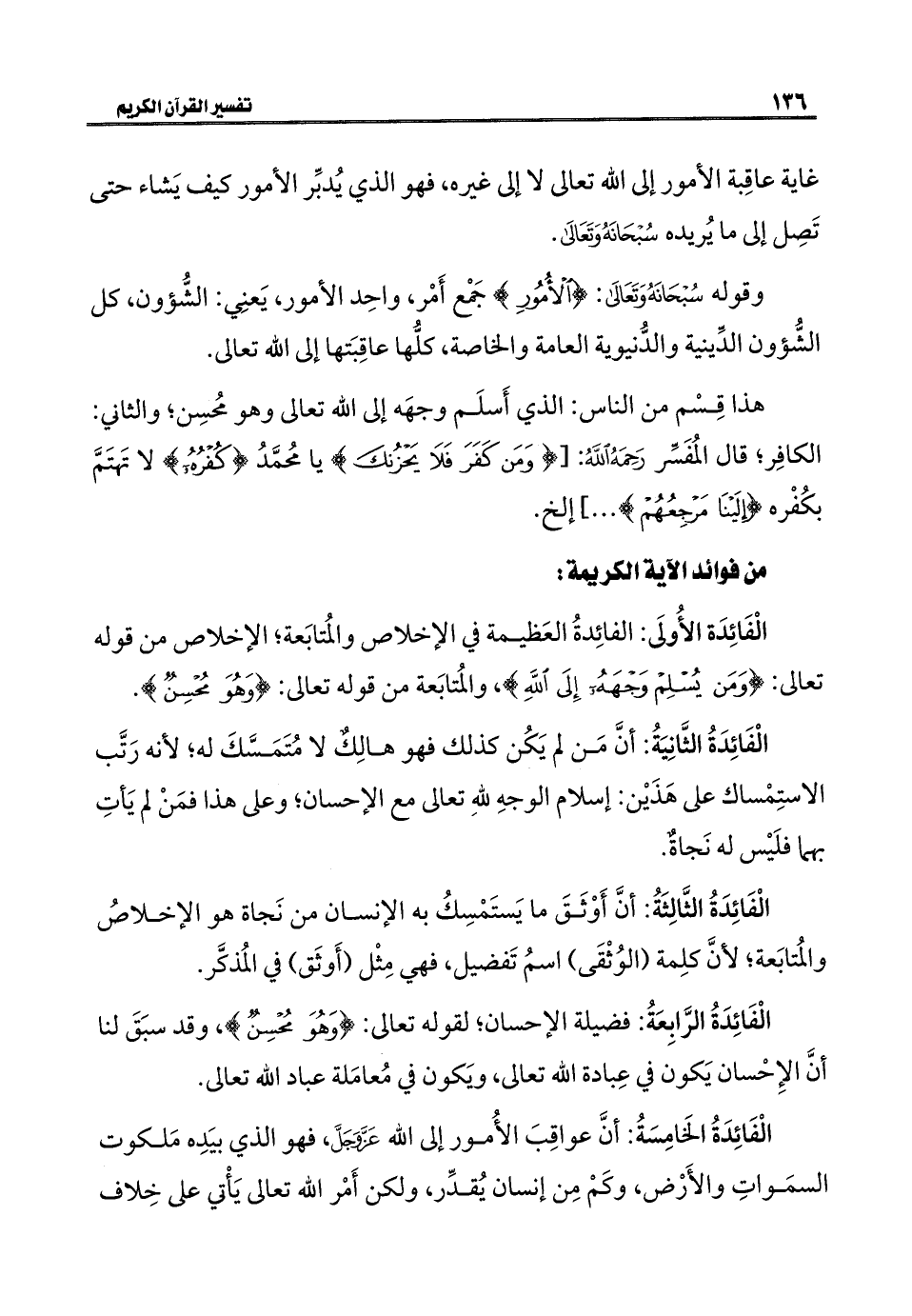 الْفَائِدَةُ الأُولَى: الفائِدةُ العَظيمة في الإخلاص والمُتابَعة؛ الإخلاص من قوله تعالى: {وَمَنْ يُسْلِمْ وَجْهَهُ إِلَى اللَّهِ}، والمُتابَعة من قوله تعالى: {وَهُوَ مُحْسِنٌ}.