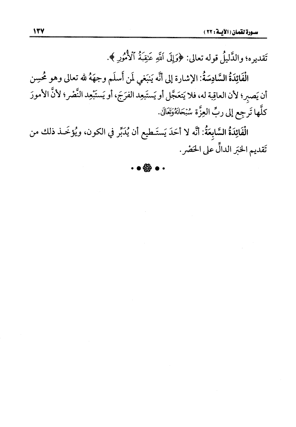 الْفَائِدَةُ السَّادِسَةُ: الإشارة إلى أنَّه يَنبَغي لمَن أَسلَم وجهَهُ للَّه تعالى وهو مُحسِن أن يَصبِر، لأن العاقِبة له، فلا يَتعَجَّل أو يَستَبعِد الفرَجَ، أو يَستَبْعِد النَّصْر؛ لأنَّ الأمورَ كلَّها تَرجِع إلى ربِّ العِزَّة سُبْحَانَهُ وَتَعَالَى.