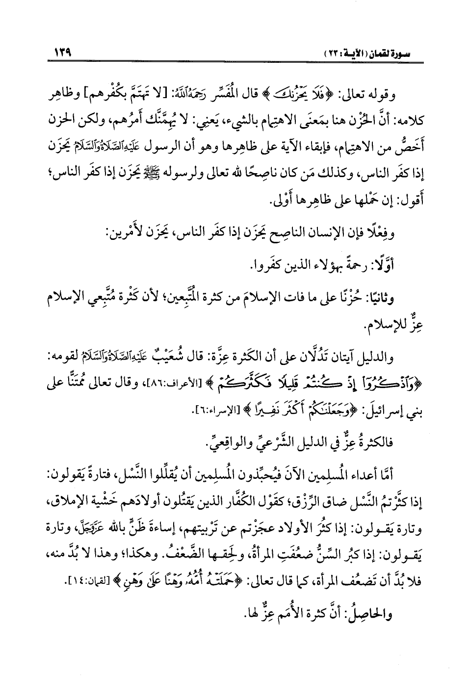 والدليل آيتان تَدُلَّان على أن الكَثرة عِزَّة: قال شُعَيْبٌ عَلَيْهِ الصَّلَاةُ وَالسَّلَامُ لقومه: {وَاذْكُرُوا إِذْ كُنْتُمْ قَلِيلًا فَكَثَّرَكُمْ} [الأعراف: ٨٦]، وقال تعالى مُمتَنًّا على بني إسرائيلَ: {وَجَعَلْنَاكُمْ أَكْثَرَ نَفِيرًا} [الإسراء: ٦].