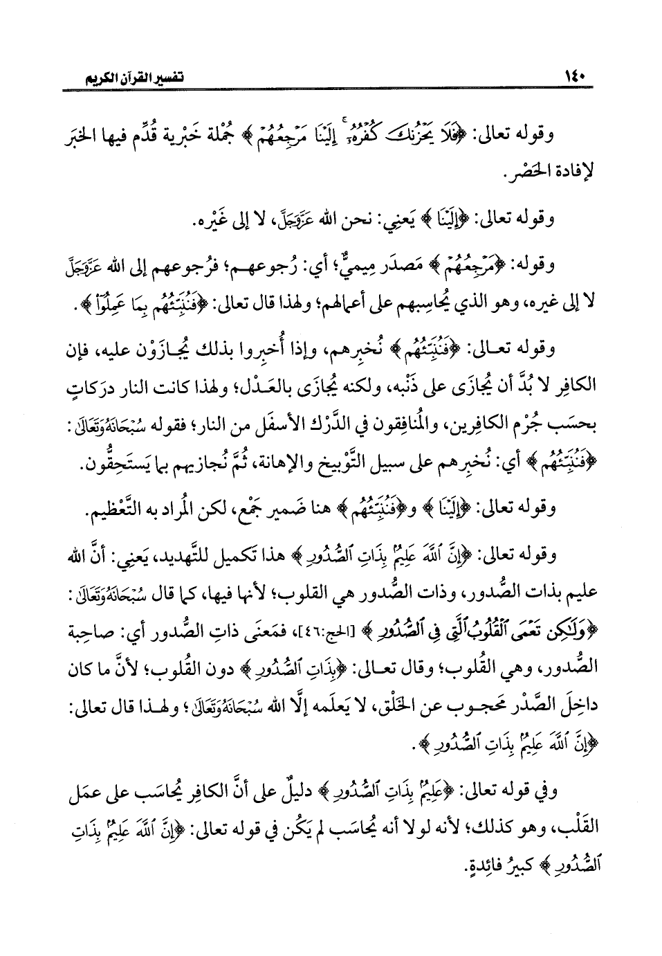 وقوله تعالى: {فَلَا يَحْزُنْكَ كُفْرُهُ إِلَيْنَا مَرْجِعُهُمْ} جُمْلة خَبْرية قُدِّم فيها الخبَر لإفادة الحَصْر.