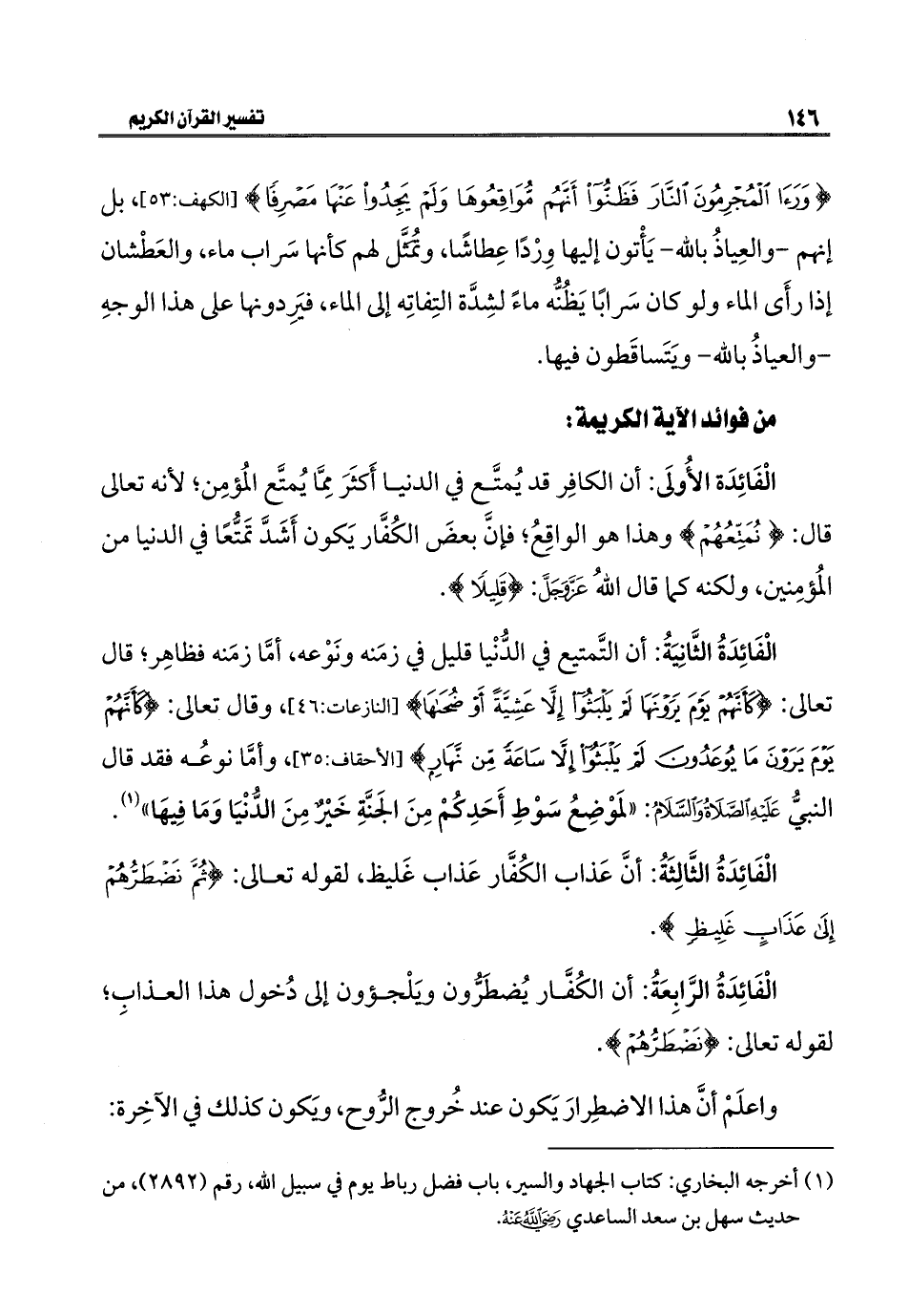 {وَرَأَى الْمُجْرِمُونَ النَّارَ فَظَنُّوا أَنَّهُمْ مُوَاقِعُوهَا وَلَمْ يَجِدُوا عَنْهَا مَصْرِفًا} [الكهف: ٥٣]، بل إنهم -والعِياذُ باللَّه- يَأْتون إليها وِرْدًا عِطاشًا، وتُمَثَّل لهم كأنها سَراب ماء، والعَطْشان إذا رأَى الماء ولو كان سَرابًا يَظُنُّه ماءً لشِدَّة التِفاتِه إلى الماء، فيَرِدونها على هذا الوجهِ -والعياذُ باللَّه- ويَتَساقَطون فيها.