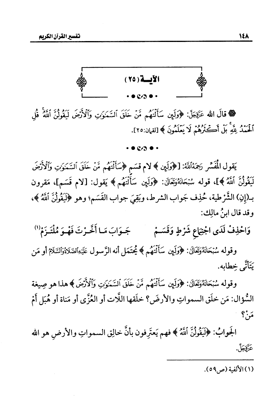 يَقول المُفَسِّر رَحِمَهُ اللَّهُ: [{وَلَئِنْ} لام قسَمٍ {سَأَلْتَهُمْ مَنْ خَلَقَ السَّمَاوَاتِ وَالْأَرْضَ لَيَقُولُنَّ اللَّهُ}] قوله سُبْحَانَهُ وَتَعَالَى: {وَلَئِنْ سَأَلْتَهُمْ} يَقول: [لام قَسَم]، مَقرون بـ (إِنِ) الشَّرْطية، حُذِف جَواب الشرط، وبَقِيَ جواب القَسَم؛ وهو {لَيَقُولُنَّ اللَّهُ}، وقد قال ابنُ مالِك: