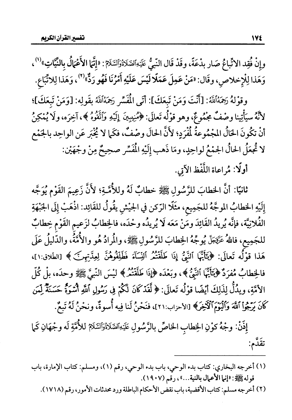 ثانيًا: أنَّ الخطابَ للرَّسُولِ - صلى الله عليه وسلم - خطابٌ لَهُ وللأُمَّةِ؛ لأَنَّ زَعِيمَ القَوْم يُوَجَّه إِلَيْهِ الخطابُ الموجَّهُ للجَمِيعِ، مثَلًا الرّكن في الجيْشِ يقُولُ للقَائِد: اذْهَبْ إِلَى الجبْهَةِ الفُلانِيَّة، فإنَّه يُريدُ القَائِدَ ومَنْ مَعَه لَا يُريدُه وحْدَه، فالخِطابُ لزَعيمِ القَوْمِ خِطابٌ للجَمِيع، فاللهُ عَزَّ وجلَّ يُوجِّهُ الخِطابَ للرَّسُولِ - صلى الله عليه وسلم -، والمُرادُ هُو والأُمَّةُ، والدّليلُ عَلَى هَذا قوْله تَعالَى: {يَاأَيُّهَا النَّبِيُّ إِذَا طَلَّقْتُمُ النِّسَاءَ فَطَلِّقُوهُنَّ لِعِدَّتِهِنَّ} [الطّلاق: ١]، فالخِطابُ مُفرَدٌ {يَاأَيُّهَا النَّبِيُّ}، وبَعْدَه {إِذَا طَلَّقْتُمُ} ليْسَ النّبيَّ - صلى الله عليه وسلم - وحدَه، بلْ كُلّ الأمَّةِ، ويدُلُّ لِذَلِكَ أيْضًا قوله تَعالَى: {لَقَدْ كَانَ لَكُمْ فِي رَسُولِ اللَّهِ أُسْوَةٌ حَسَنَةٌ لِمَنْ كَانَ يَرْجُو اللَّهَ وَالْيَوْمَ الْآخِرَ} [الأحزاب: ٢١]، فنَحْنُ لَنا فِيه أُسوةٌ، ونحْنُ لَهُ تَبعٌ.