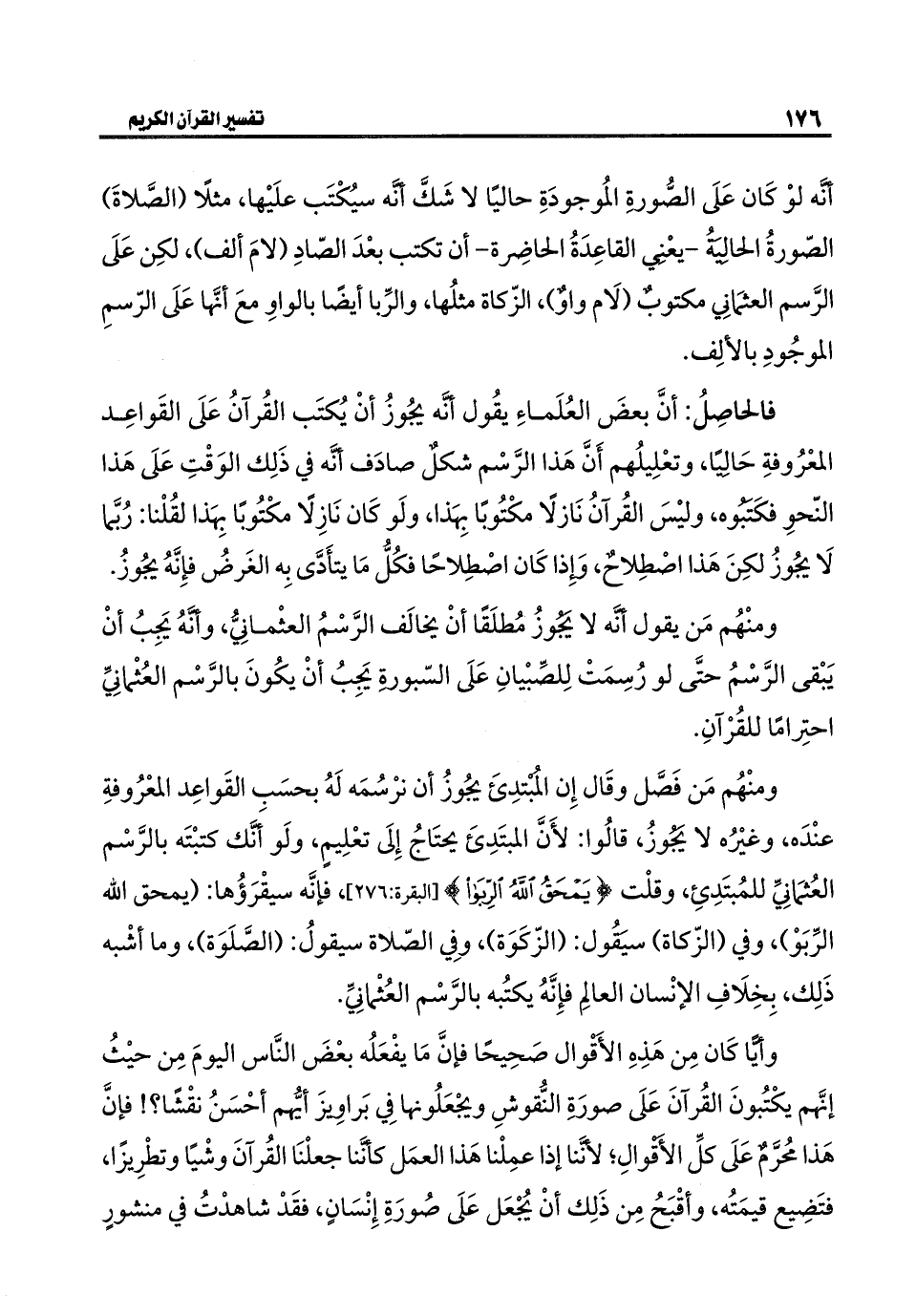 أنَّه لوْ كَان عَلَى الصُّورةِ المُوجودَةِ حاليًا لا شَكَّ أنَّه سيُكْتَب علَيْها، مثلًا (الصَّلاةَ) الصّورةُ الحاليةُ - يعْنِي القاعِدَةُ الحاضِرة - أن تكتب بعْدَ الصّادِ (لامَ ألف)، لكِن عَلَى الرَّسم العثمَانِي مكتوبٌ (لَام واوٌ)، الزّكاة مثلُها، والرِّبا أيضًا بالواوِ معَ أنَّها عَلَى الرّسمِ الموجُودِ بالألِف.
