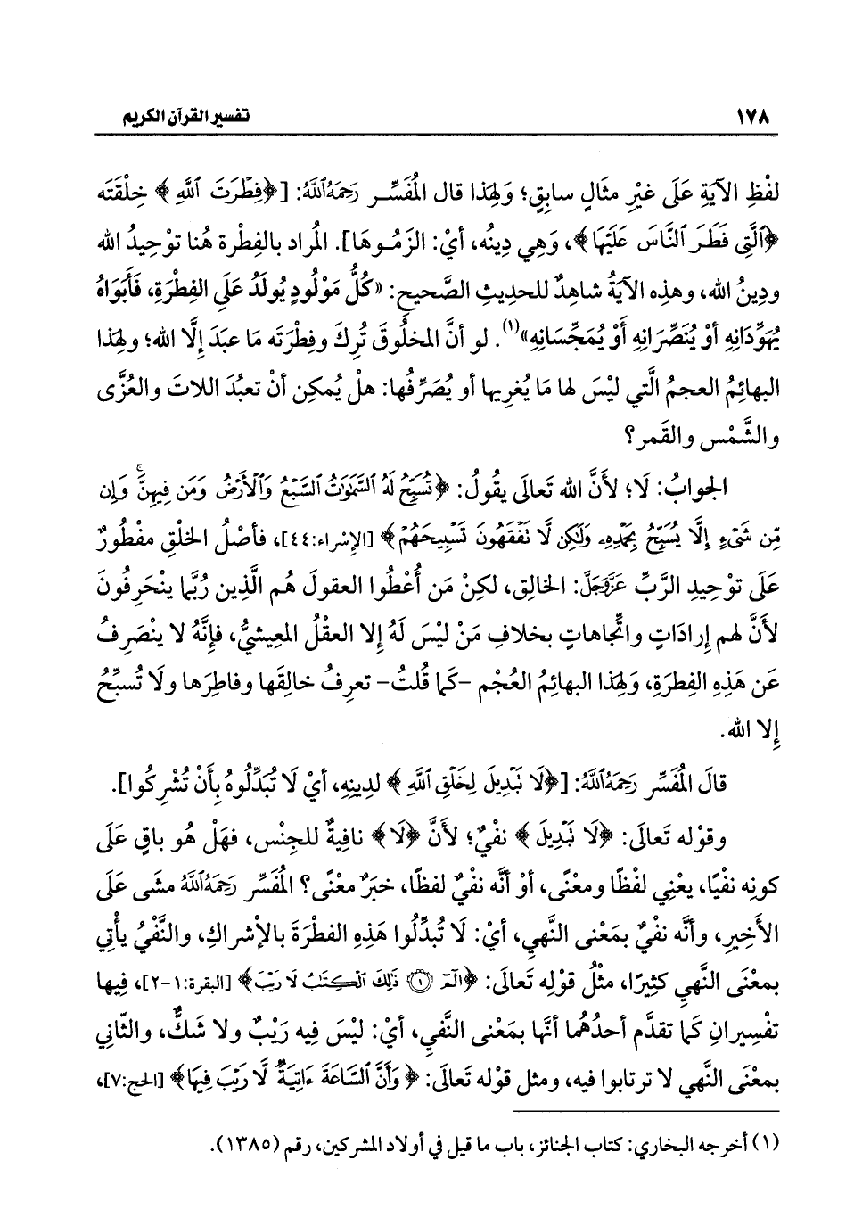 وقوْله تَعالَى: {لَا تَبْدِيلَ} نفْيٌ؛ لأَنَّ {لَا} نافِيةٌ للجِنْس، فهَلْ هُو باقٍ عَلَى كونِه نفْيًا، يعْنِي لفْظًا ومعْنًى، أوْ أنَّه نفْيٌ لفظًا، خبَرٌ معْنًى؟ المُفَسِّر رَحَمَهُ اَللهُ مشَى عَلَى الأَخِير، وأَنَّه نفْيٌ بمَعْنى النَّهيِ، أيْ: لَا تُبدِّلُوا هَذِهِ الفطْرَةَ بالإْشراكِ، والنَّفْيُ يأْتِي بمعْنَى النَّهيِ كثِيرًا، مثْلُ قوْلِه تَعالَى: {الم (١) ذَلِكَ الْكِتَابُ لَا رَيْبَ} [البقرة: ١ - ٢]، فِيها تفْسِيرانِ كَما تقدَّم أحدُهُما أنَّها بمَعْنى النَّفيِ، أيْ: ليْسَ فِيه ريبٌ ولا شَكٌّ، والثّانِي بمعْنَى النَّهي لا ترتابوا فيه، ومثل قوْله تَعالَى: {وَأَنَّ السَّاعَةَ آتِيَةٌ لَا رَيْبَ فِيهَا} [الحج: ٧]،