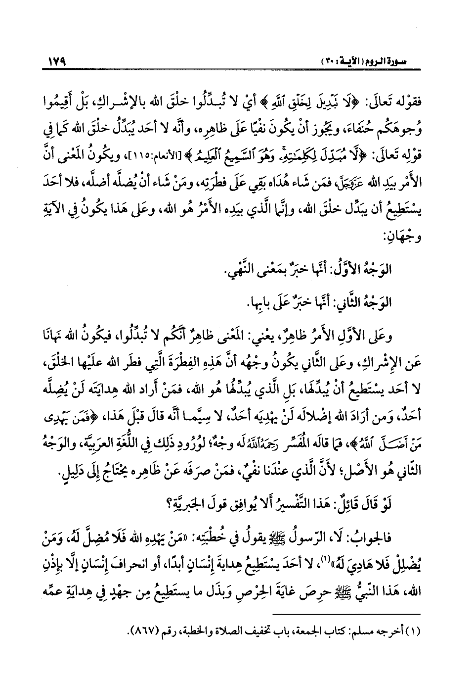 وعَلى الأوَّلِ الأَمرُ ظاهِرٌ، يعْني: المَعْنى ظاهِرٌ أنَّكُم لا تُبدِّلُوا، فيكُونُ الله نَهانَا عَن الإِشْراكِ، وعَلى الثَّاني يكُونُ وجْهُه أنَّ هَذِهِ الفِطْرَةَ الَّتِي فطَر الله علَيْها الخلْقَ، لا أحَد يسْتَطيعُ أنْ يُبدِّلَها، بَلِ الَّذي يُبدِّلُها هُو الله، فمَنْ أَراد الله هِدايَتَه لَنْ يُضِلَّه أحَدٌ، وَمن أرَادَ الله إضْلالَه لَنْ يهْدِيَه أحَدٌ، لا سِيَّما أنَّه قالَ قبْلَ هَذا، {فَمَنْ يَهْدِي مَنْ أَضَلَّ اللَّهُ}، فما قالَه المُفَسِّر رَحَمَهُ اللَّهُ لَه وجْهٌ؛ لوُرُودِ ذَلِك في اللّغَةِ العرَبِيَّة، والوَجْهُ الثّاني هُو الأَصْل؛ لأَنَّ الَّذي عنْدَنا نفْيٌ، فمَنْ صرَفَه عَنْ ظَاهِره يحْتَاجُ إِلَى دَلِيلٍ.