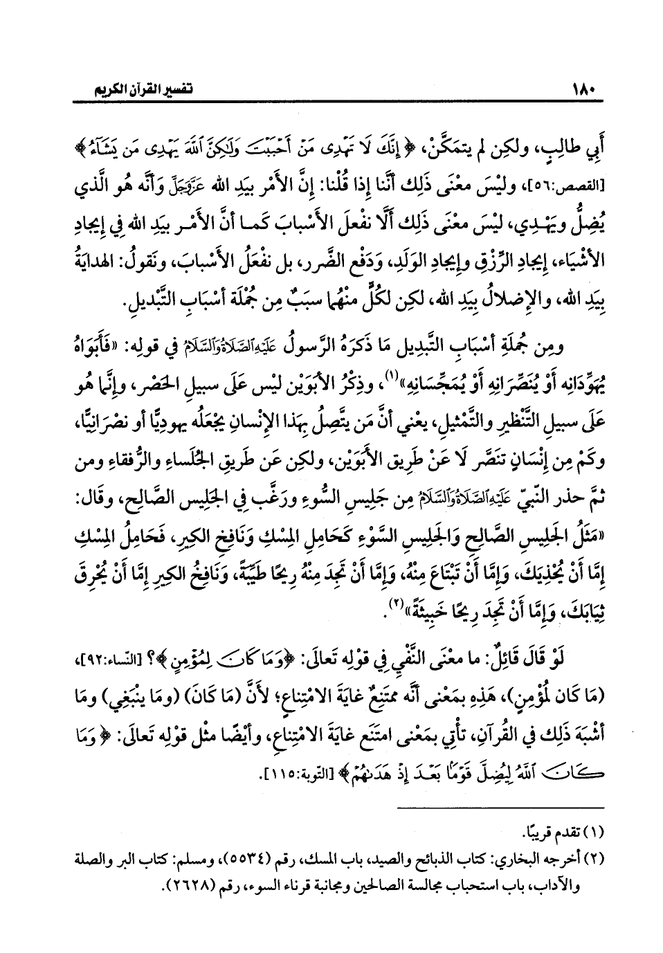 أَبِي طالِبٍ، ولكِن لم يتمَكَنْ، {إِنَّكَ لَا تَهْدِي مَنْ أَحْبَبْتَ وَلَكِنَّ اللَّهَ يَهْدِي مَنْ يَشَاءُ} [القصص: ٥٦]، وليْسَ معْنَى ذَلِك أنَّنا إِذا قُلْنا: إِنَّ الأَمْر بيَدِ الله عَزَّ وَجَلَّ وَأَنَّه هُو الَّذي يُضِلُّ ويَهْدِي، ليْسَ معْنَى ذَلِك أَلَّا نفْعلَ الأَسْبابَ كَما أنَّ الأَمْر بيَدِ الله في إِيجادِ الأشْيَاء، إِيجادِ الرِّزْقِ وإِيجادِ الوَلَدِ، وَدَفْع الضَّرر، بل نفْعَلُ الأَسْبابَ، ونَقولُ: الهدايَةُ بِيَدِ الله، والإِضلالُ بِيَدِ الله، لكِن لكُلٍّ منْهُما سبَبٌ مِن جُمْلَة أسْبَابِ التَّبْديلِ.