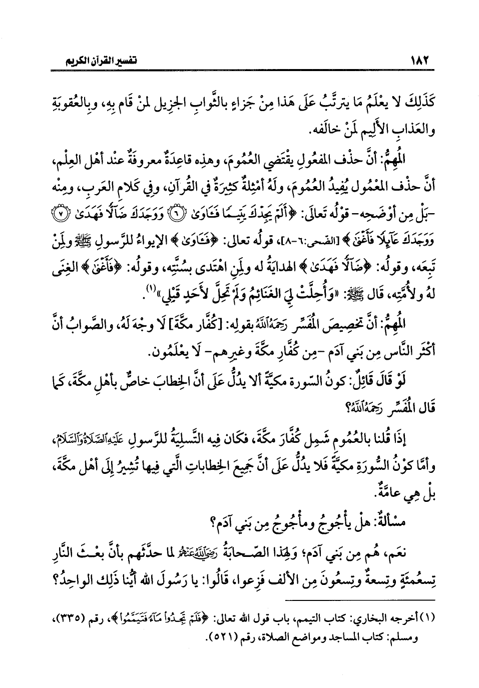 المُهِمُّ: أنَّ حذْف المفعُولِ يقْتَضي العُمُومَ، وهذِه قاعِدَةٌ معروفَةٌ عنْد أهْل العِلْم، أنَّ حذْف المعْمُول يفيدُ العُمُومَ، ولَهُ أمْثِلةٌ كثِيرَةٌ في القُرآنِ، وفِي كَلامِ العَربِ، ومنْه - بَلْ مِن أوْضَحِه - قوْلُه تَعالَى: {أَلَمْ يَجِدْكَ يَتِيمًا فَآوَى (٦) وَوَجَدَكَ ضَالًّا فَهَدَى (٧) وَوَجَدَكَ عَائِلًا فَأَغْنَى} [الضحى: ٦ - ٨]، قولُه تعالى: {فَآوَى} الإيواءُ للرَّسولِ - صلى الله عليه وسلم - ولمِنْ تَبِعَه، وقولُه: {ضَالًّا فَهَدَى} الهدايَةُ له ولمِنِ اهْتَدى بسُنَّتِه، وقولُه: {فَأَغْنَى} الغِنَى لهُ ولأُمَّتِه، قَال - صلى الله عليه وسلم -: "وَأُحِلَّتْ لِيَ الغَنَائِمُ وَلَمْ تَحِلَّ لأَحَدٍ قَبْلي" (¬١).