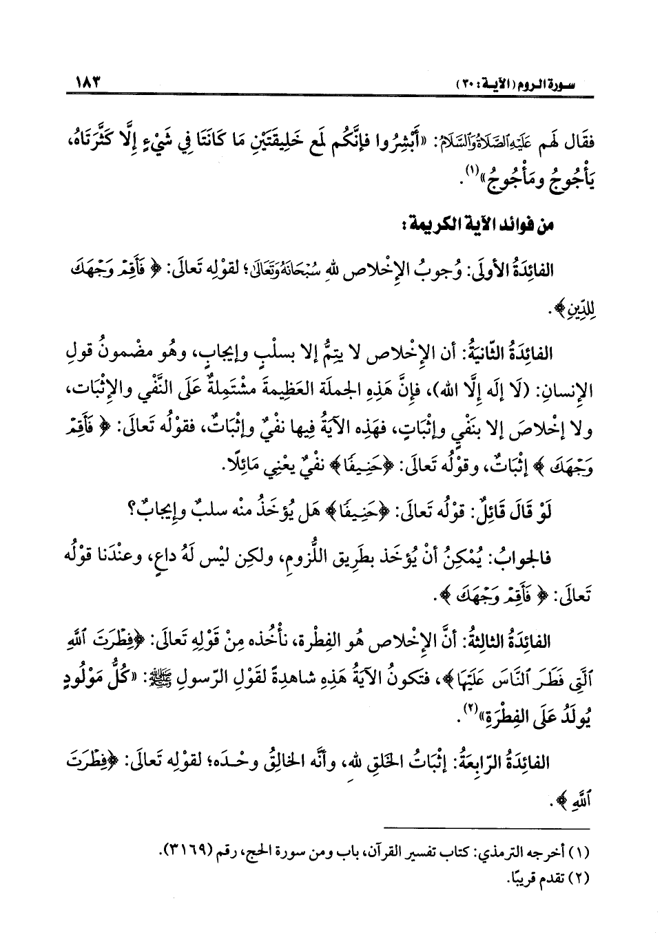 الفائِدَةُ الثَّالثةُ: أنَّ الإِخْلاص هُو الفِطْرة، نأْخُذه مِنْ قَوْلِهِ تَعالَى: {فِطْرَتَ اللَّهِ الَّتِي فَطَرَ النَّاسَ عَلَيْهَا}، فتكونُ الآيَةُ هَذِهِ شاهدِةً لقَوْلِ الرّسولِ - صلى الله عليه وسلم -: "كُلُّ مَوْلُودٍ يُولَدُ عَلَى الفِطْرَةِ" (¬٢).
