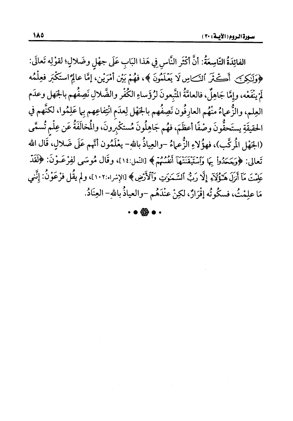 الفائِدَةُ التاسعةُ: أنَّ أكْثَر النَّاسِ في هَذا البَابِ عَلَى جهْلٍ وضَلالٍ؛ لقوْلِه تَعالَى: {وَلَكِنَّ أَكْثَرَ النَّاسِ لَا يَعْلَمُونَ}، فهُمْ بَيْن أمْرَيْن، إمَّا عالِمٌ استكْبَر فعِلْمُه لَمْ ينْفَعْه، وإِمَّا جَاهِلٌ، فالعامَّةُ المتَّبِعونَ لرُؤَساءِ الكُفْر والضَّلالِ نَصِفُهم بالجهل وعدَم العِلم، والزُّعماءُ منْهُم العارِفُون نَصِفُهم بالجهْل لِعدَمِ انْتِفاعِهم بِما عَلِمُوا، لكنَّهم في الحقيقَةِ يستَحقُّونَ وصْفًا أعظَمَ، فهُم جَاهِلُونَ مُستكْبِرونَ، والمُخالَفَةُ عَن عِلْمٍ تُسمَّى (الجَهْل المُركَّب)، فهؤُلاءِ الزُّعماءُ - والعِياذُ باللهِ - يعْلَمُون أنَّهم عَلَى ضَلالٍ، قَال الله تَعالى: {وَجَحَدُوا بِهَا وَاسْتَيْقَنَتْهَا أَنْفُسُهُمْ} [النّمل: ١٤]، وقَال مُوسَى لفِرْعَوْنَ: {لَقَدْ عَلِمْتَ مَا أَنْزَلَ هَؤُلَاءِ إِلَّا رَبُّ السَّمَاوَاتِ وَالْأَرْضِ} [الإِسْراء: ١٠٢]، ولم يقُل فرْعَوْنُ: إِنَّني مَا علِمْتُ، فسكُوتُه إقْرَارٌ، لكِنْ عنْدَهُم - والعياذُ باللهِ - العِنَادُ.