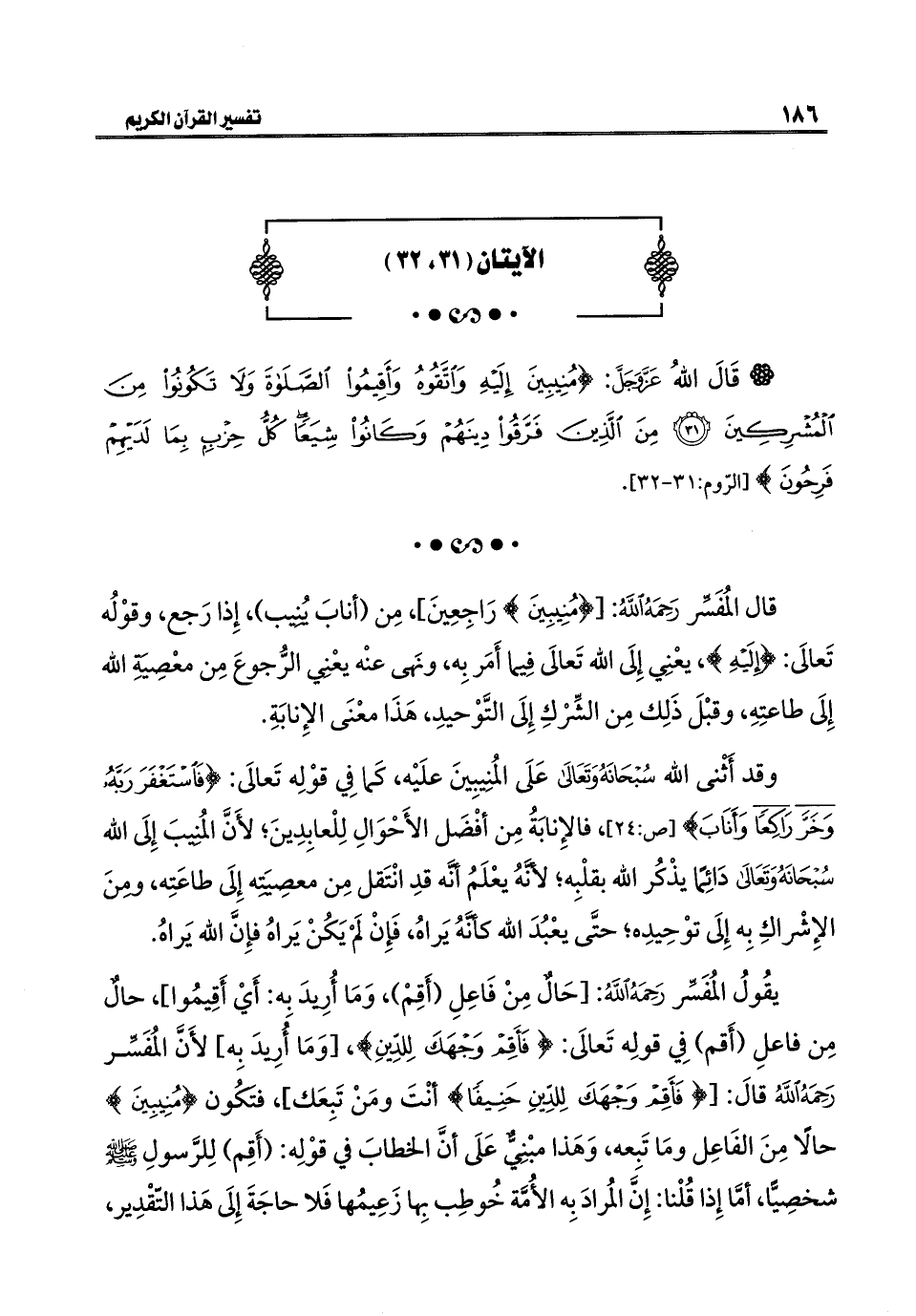 قَالَ المُفَسِّر رَحَمَهُ الله: [{مُنِيبِينَ} رَاجِعِينَ]، مِن (أنابَ يُنِيب)، إِذا رَجع، وقوْلُه تَعالَى: {إِلَيْهِ}، يعْنِي إِلَى الله تَعالَى فِيما أَمَر بِه، ونَهى عنْه يعْنِي الرُّجوعَ مِن معْصِيَةِ الله إِلَى طاعتِهِ، وقبْلَ ذَلِك مِن الشّرْكِ إِلَى التَّوْحيدِ، هَذَا معْنَى الإِنابَةِ.