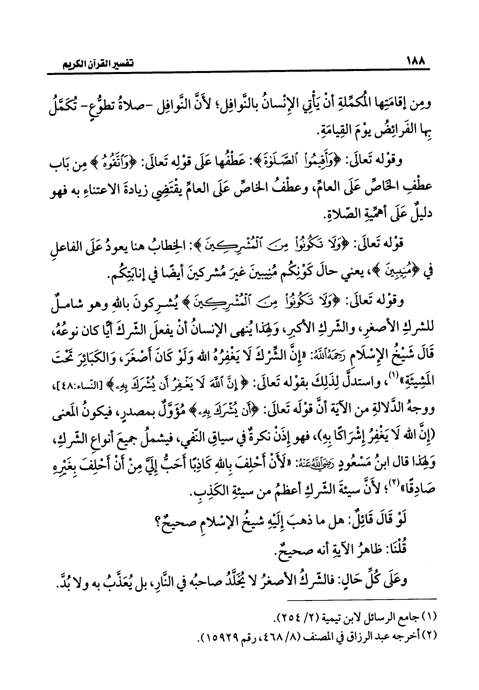 وقوْله تَعالَى: {وَلَا تَكُونُوا مِنَ الْمُشْرِكِينَ} يُشرِكونَ بالله وهو شاملٌ للشركِ الأصغرِ، والشّركِ الأكبرِ، وَهذا يُنهى الإنسانُ أنْ يفعلَ الشّركَ أيًّا كان نوعُهُ، قَالَ شَيْخُ الإسْلَامِ رَحَمَهُ الله: "إِنَّ الشِّرْكَ لَا يَغْفِرُهُ الله وَلَوْ كَانَ أَصْغَرَ، وَالكَبَائِرَ تَحْتَ المَشِيئَةِ" (¬١)، وَاستدلَّ لِذَلِكَ بقوْله تَعالَى: {إِنَّ اللَّهَ لَا يَغْفِرُ أَنْ يُشْرَكَ بِهِ} [النساء: ٤٨]، ووجهُ الدَّلالةِ من الآيَة أنَّ قوْلَه تَعالَى: {أَنْ يُشْرَكَ بِهِ} مُؤَوَّلٌ بمصدرِ، فيكونُ المَعنى (إِنَّ الله لَا يَغْفِرُ إِشْرَاكًا بِهِ)، فهو إِذَنْ نكرةٌ في سياقِ النّفي، فيشملُ جميعَ أنواعِ الشّركِ، وَلِهَذا قال ابنُ مَسْعُودٍ - رضي الله عنه -: "لَأَنْ أَحْلِفَ بِاللهِ كَاذِبًا أَحَبُّ إِلَيَّ مِنْ أَنْ أَحْلِفَ بِغَيْرِهِ صَادِقًا" (¬٢)، لأَنَّ سيئةَ الشّركِ أعظمُ من سيئةِ الكَذِبِ.
