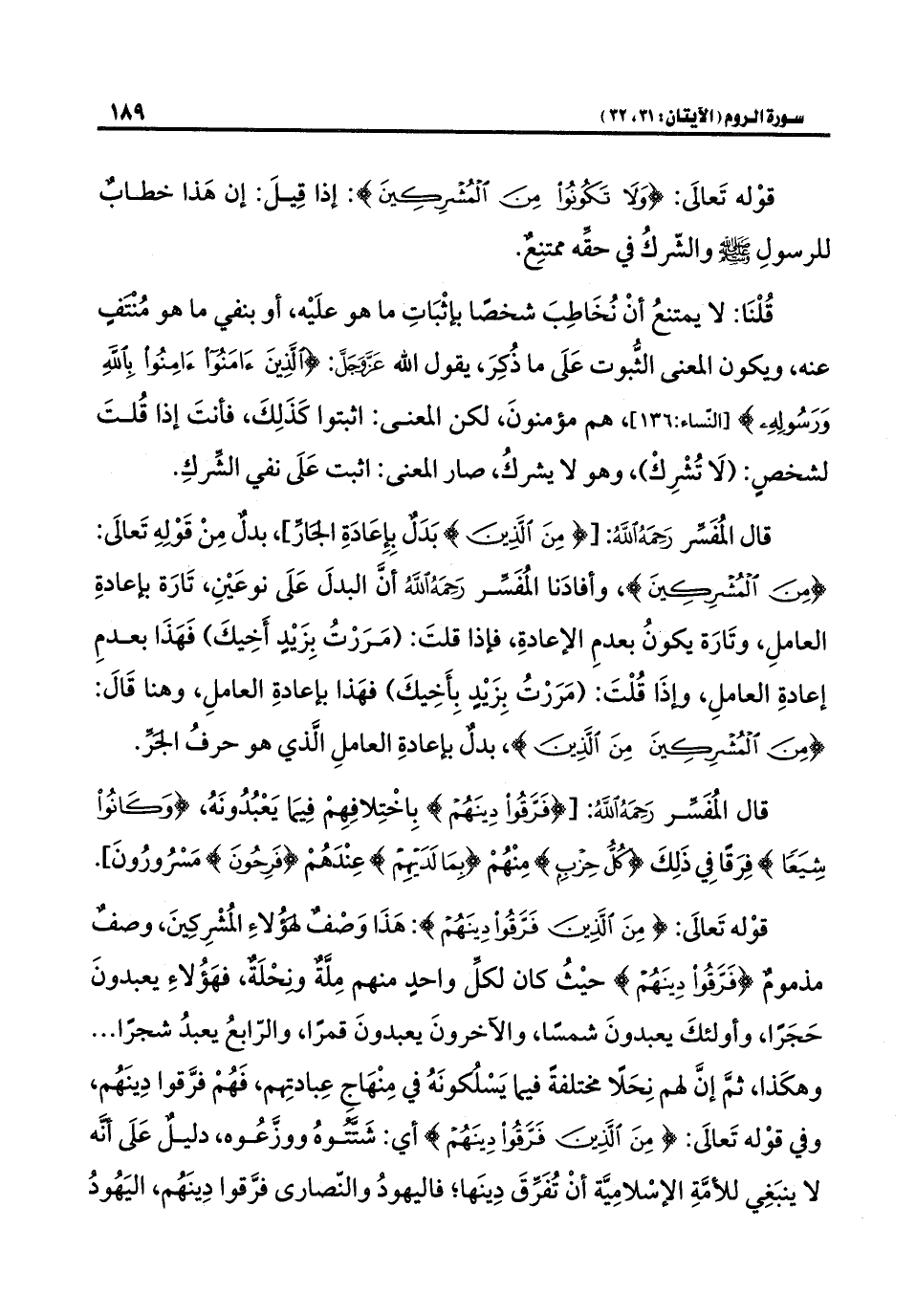 قال المُفَسّر رَحَمَهُ الله: [{مِنَ الَّذِينَ} بَدَلٌ بِإِعَادَةِ الجارِّ]، بدلٌ مِنْ قَوْلِهِ تَعالَى: {مِنَ الْمُشْرِكِينَ}، وأفادَنا المُفَسّر رَحَمَهُ الله أنَّ البدلَ عَلَى نوعَيْنِ، تَارَة بإعادةِ العاملِ، وتَارَة يكونُ بعدمِ الإعادةِ، فإذا قلتَ: (مَرَرْتُ بِزَيْدٍ أَخِيكَ) فَهَذَا بعدمِ إعادةِ العاملِ، وإذَا قُلْتَ: (مَرَرْتُ بِزَيْدٍ بِأَخِيكَ) فهَذا بإعادةِ العاملِ، وهنا قَالَ: {مِنَ الْمُشْرِكِينَ (٣١) مِنَ الَّذِينَ}، بدلٌ بإعادةِ العاملِ الَّذي هو حرفُ الجرِّ.
