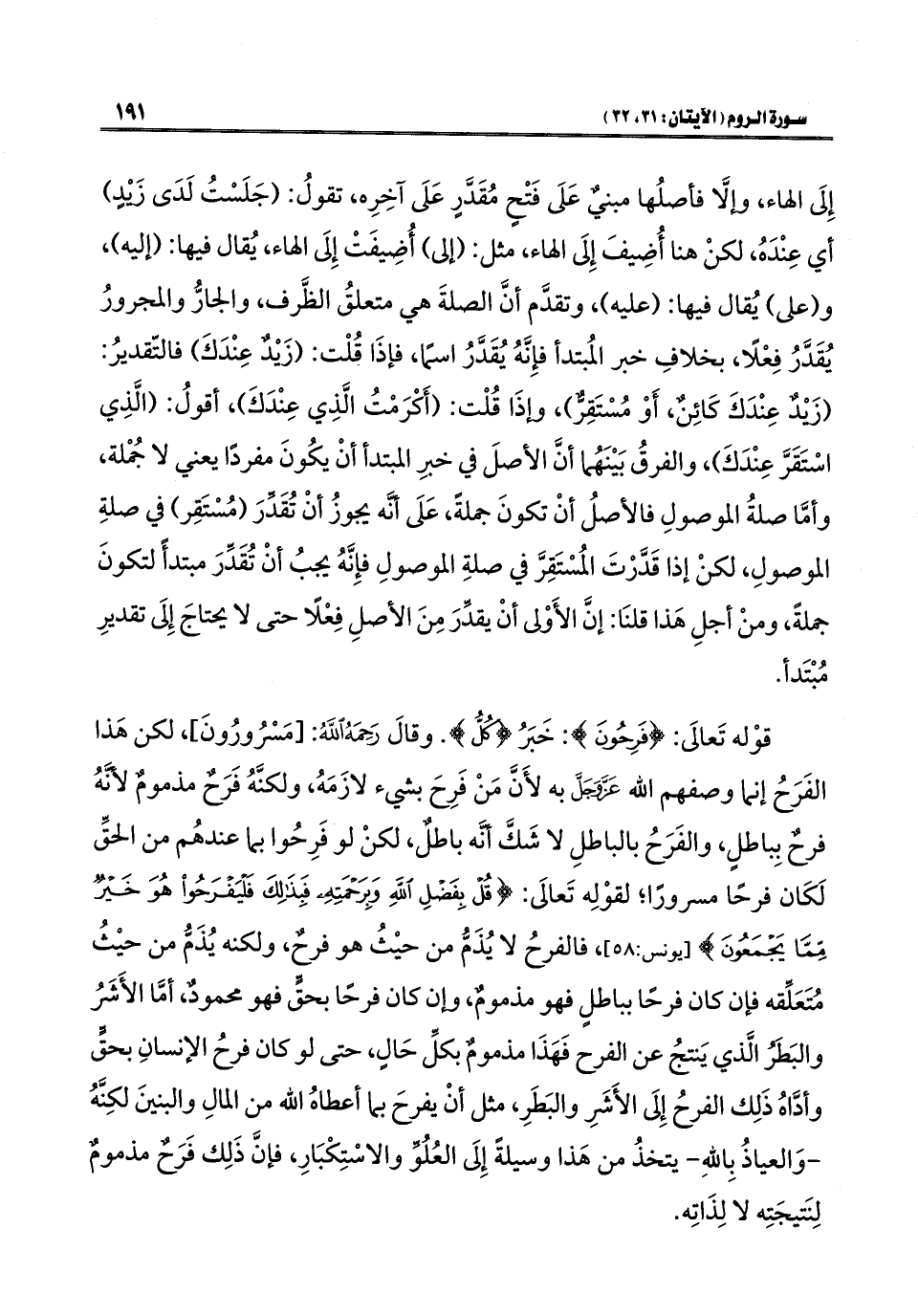 قوْله تَعالَى: {فَرِحُونَ}: خَبَرُ {كُلُّ}. وقالَ رَحَمَهُ اللهُ: [مَسْرُورُونَ]، لكن هَذا الفَرَحُ إنما وصفهم الله عَزَّ وَجَلَّ به لأَنَّ مَنْ فَرِحَ بشيء لازَمَهُ، ولكنَّهُ فَرَحٌ مذمومٌ لأَنَّهُ فرحٌ بِباطلٍ، والفَرَحُ بالباطلِ لا شَكَّ أنَّه باطلٌ، لكنْ لو فَرِحُوا بما عندهُم من الحقِّ لَكَان فرحًا مسرورًا؛ لقوْلِه تَعالَى: {قُلْ بِفَضْلِ اللَّهِ وَبِرَحْمَتِهِ فَبِذَلِكَ فَلْيَفْرَحُوا هُوَ خَيْرٌ مِمَّا يَجْمَعُونَ} [يونس: ٥٨]، فالفرحُ لا يُذَمّ من حيْثُ هو فرح، ولكنه يُذَمُّ من حيْثُ مُتَعَلِّقه فإن كان فرحًا بباطلٍ فهو مذمومٌ، وإن كان فرحًا بحقٍّ فهو محمودٌ، أمَّا الأَشَرُ والبَطر الَّذي يَنتجُ عن الفرح فَهَذَا مذمومٌ بكلِّ حَالٍ، حتى لو كان فرحُ الإنسانِ بحقٍّ وأدَّاهُ ذَلِك الفرحُ إِلَى الأَشَرِ والبَطَرِ، مثل أنْ يفرحَ بما أعطاهُ الله من المالِ والبنينَ لكِنَّهُ - وَالعياذُ بِاللهِ - يتخذُ من هَذا وسيلةً إِلَى العُلُوِّ والاسْتِكْبَارِ، فإنَّ ذَلِك فَرَحٌ مذمومٌ لِنَتيجَتِه لا لِذَاتِه.